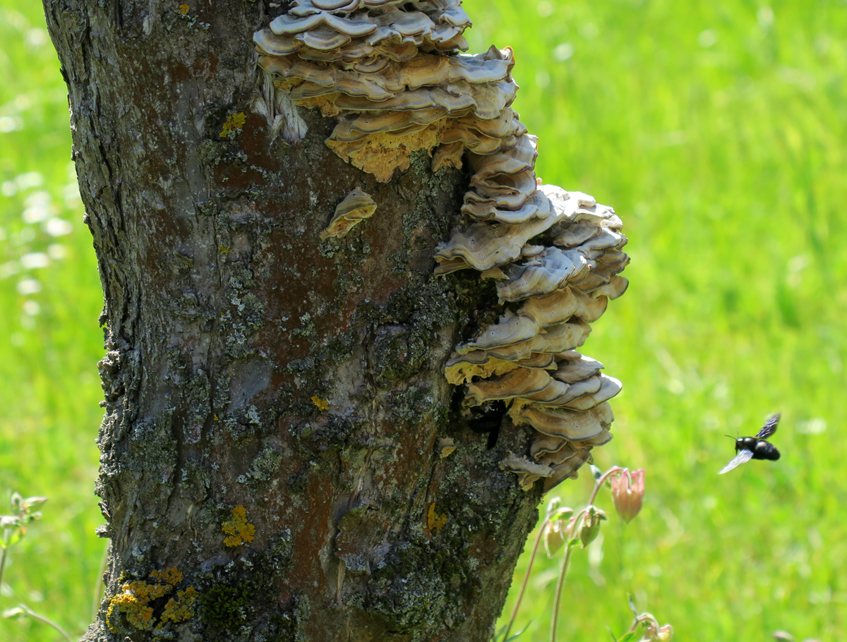 In Nachbars Garten steht der Stumpf eines verpilzten Apfelbaumes, der im Sept. 2017 abgebrochen war,