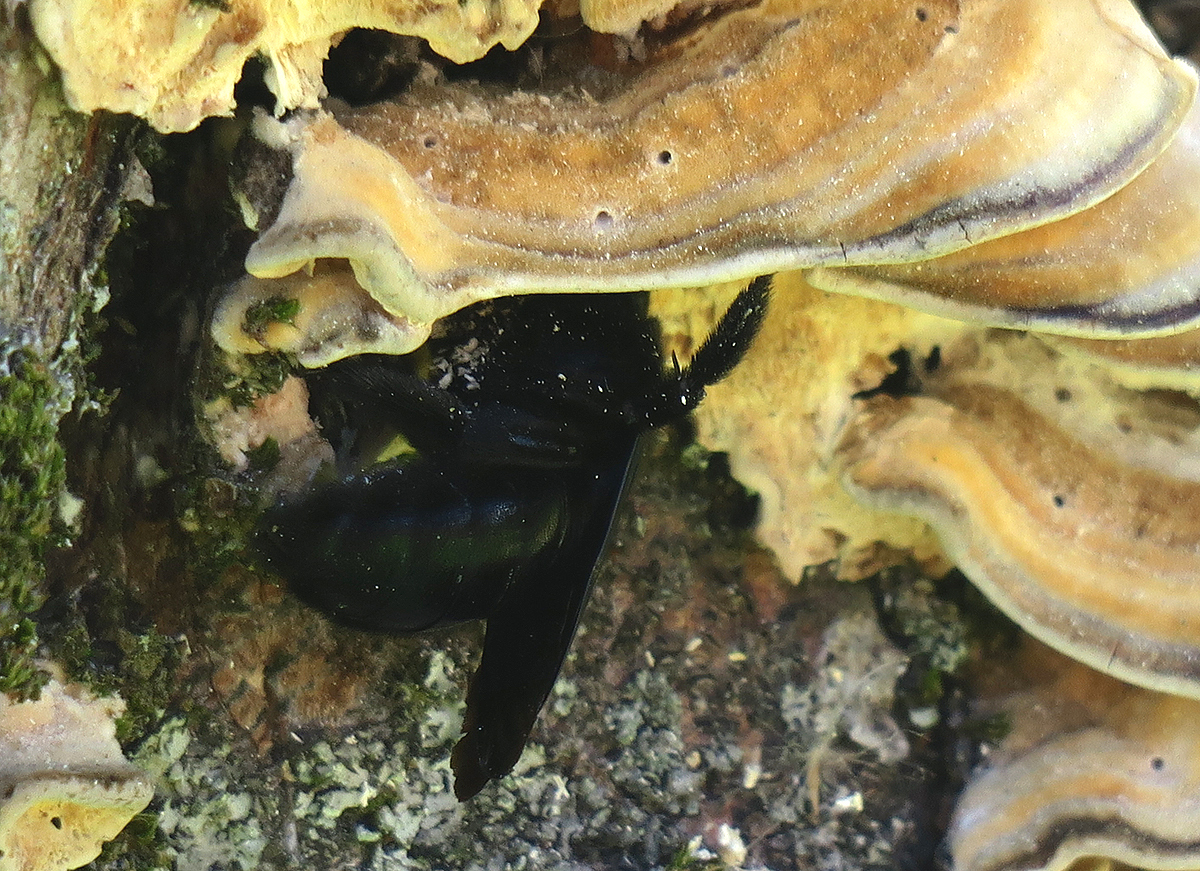 Da rieseln die Späne: Ein erstes Weibchen beginnt, sich in das weiche Pilzholz einzunagen!