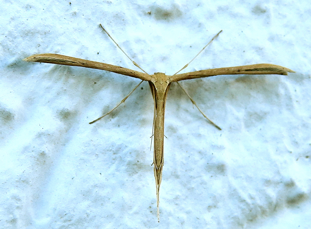 Es ist ein Schmetterling! Die Flügel sind entlang der Hauptadern in federförmige Einzelteile aufgespalten (Fam. Pterophoridae, griech,-lat. = Federträger).