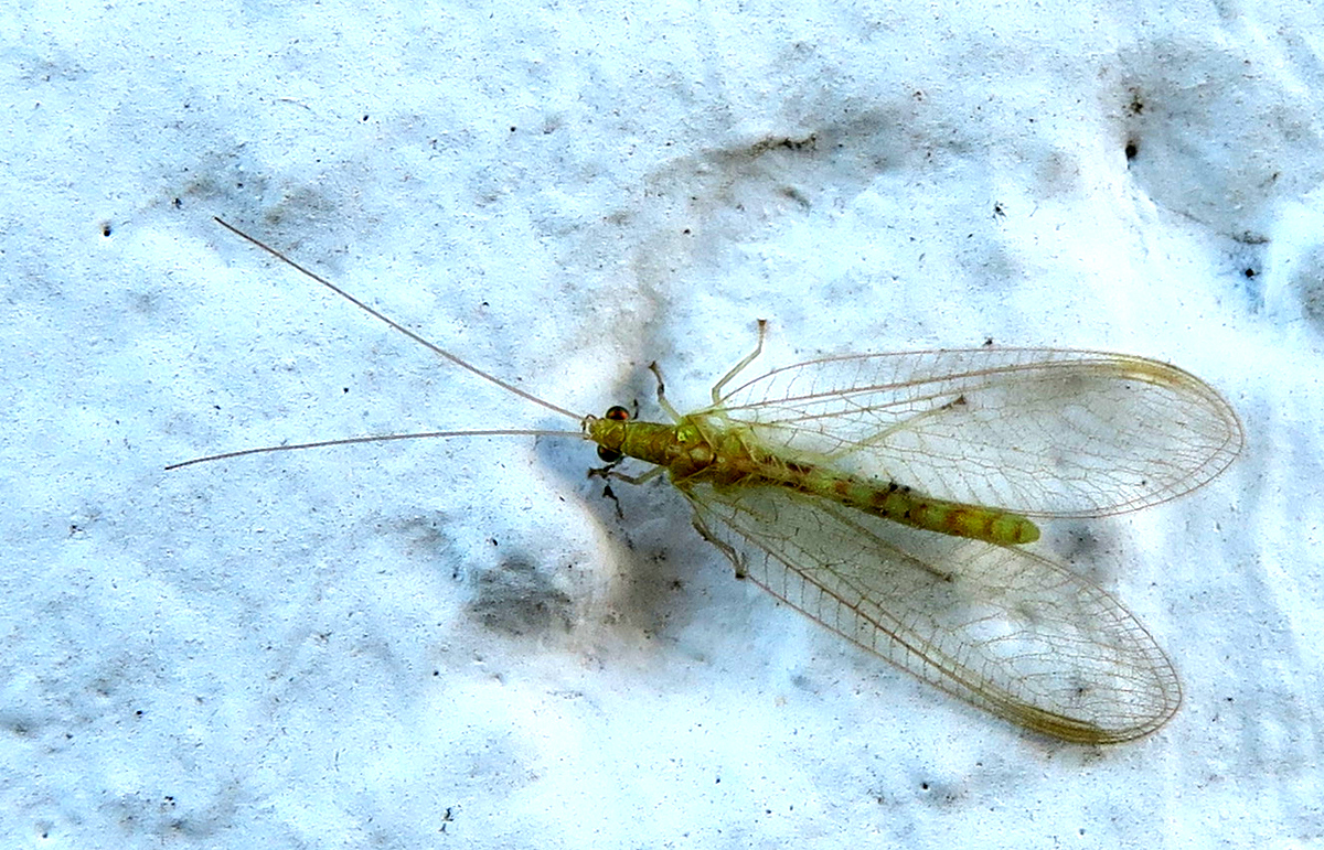 Es ist eine „Wanderart“; ihre Larven fressen Blattläuse. So ist die Kleine wohl zugewandert und versehentlich auf dem Teich gelandet. Sie wurde von einem schwachen Wind