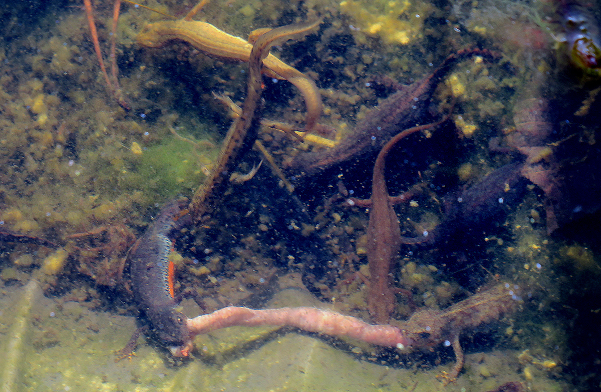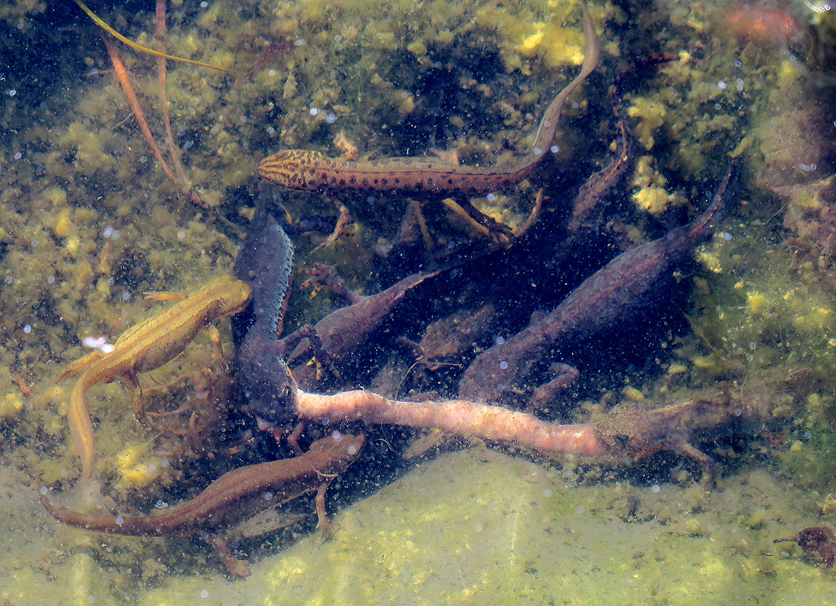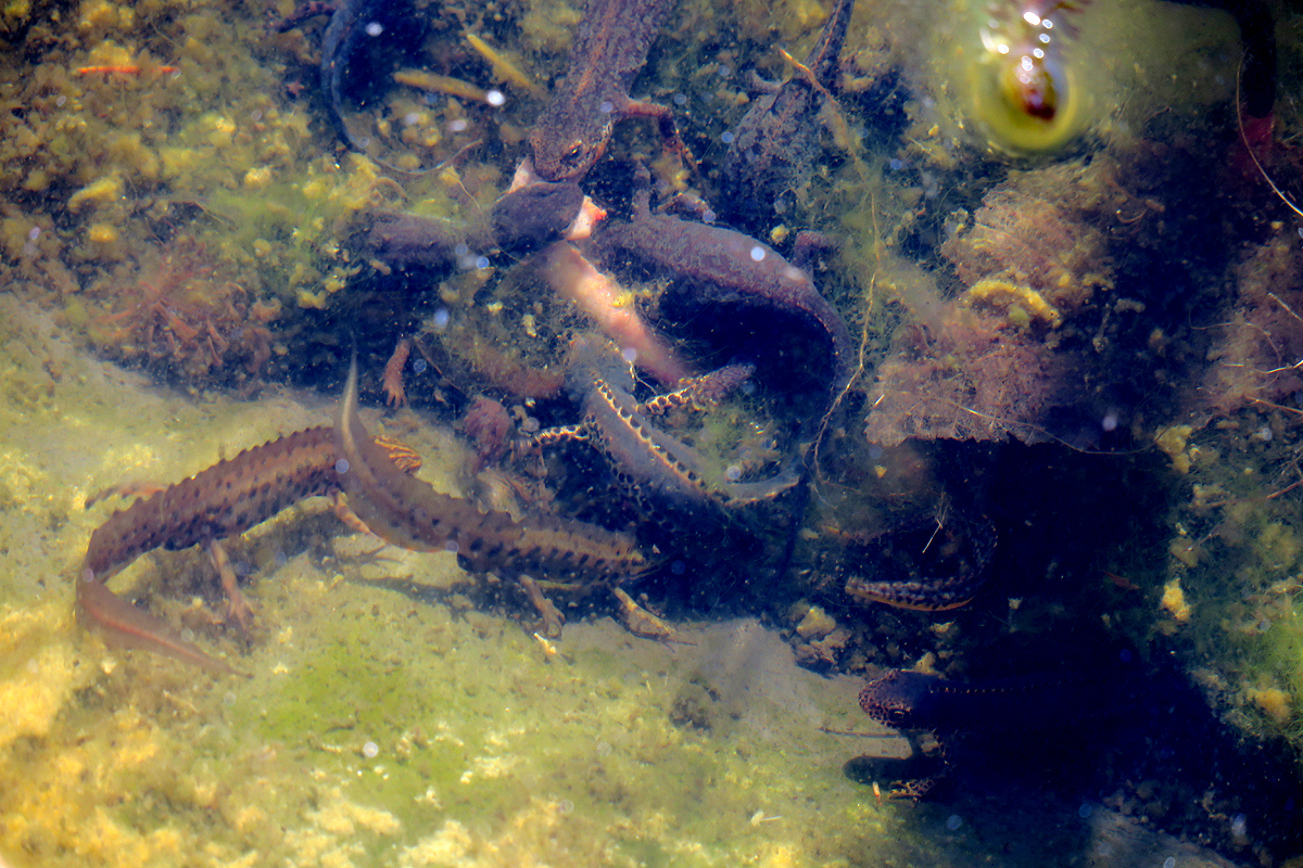 An einer Stelle ist wildes Getümmel. Teichmolche: bräunlich, zwei Männchen mit gezacktem Rückenkamm; Bergmolche: graublau,