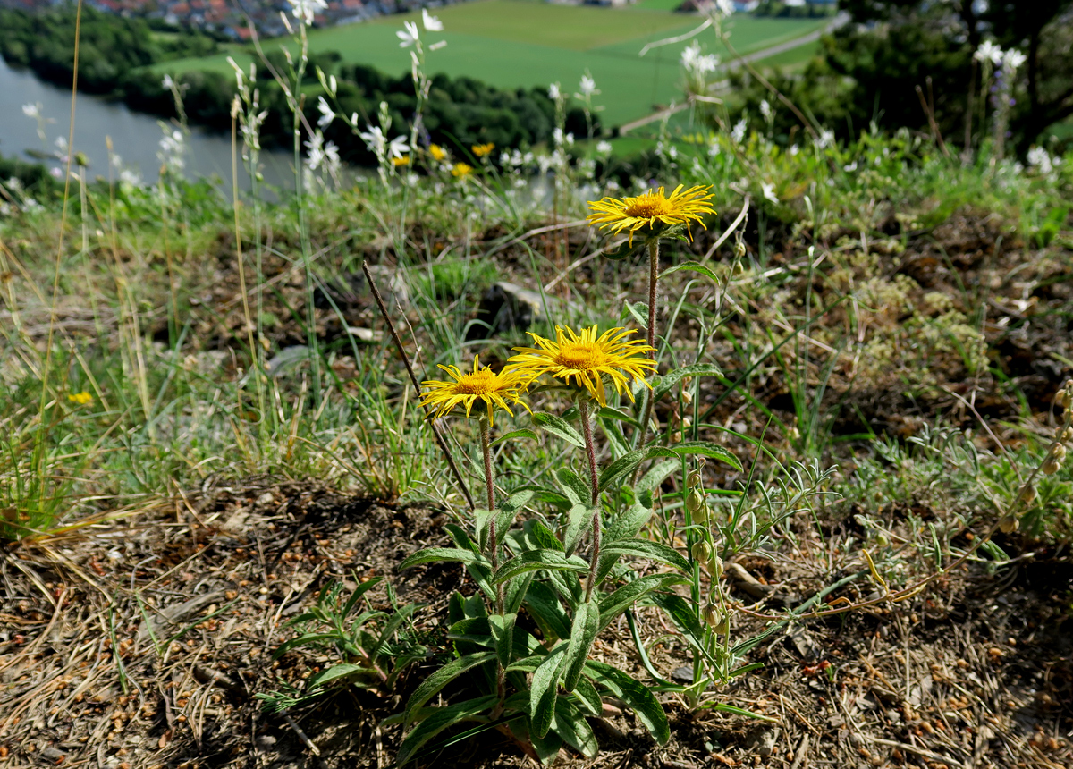 Inula hirta (neuerdings: Pentanema hirtum), der Raue Alant oder Rauhaarige Alant ist eine Charakterpflanze trockenwarmer Standorte, hier bei Karlstadt am Main. Die ausdauernde Pflanze lebt bei mir im Garten seit >35 Jahren und blüht regelmäßig. Anscheinend ist sie selbst-steril, denn es gibt niemals Jungpflanzen.