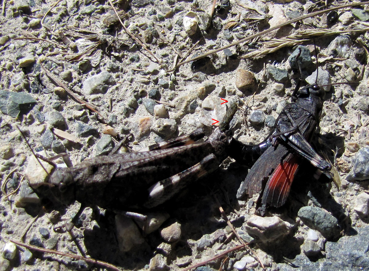 Es war im September 2012, auf einer Urlaubsreise in das Briançonnais in den französischen Alpen. Vor uns auf dem Wanderweg entdeckten wir zwei dunkle Heuschrecken, offenkundig in Paarung. Erst am Monitor, bei der Bearbeitung des Fotos, wurde mir klar, was ich da nichtsahnend erwischt hatte.