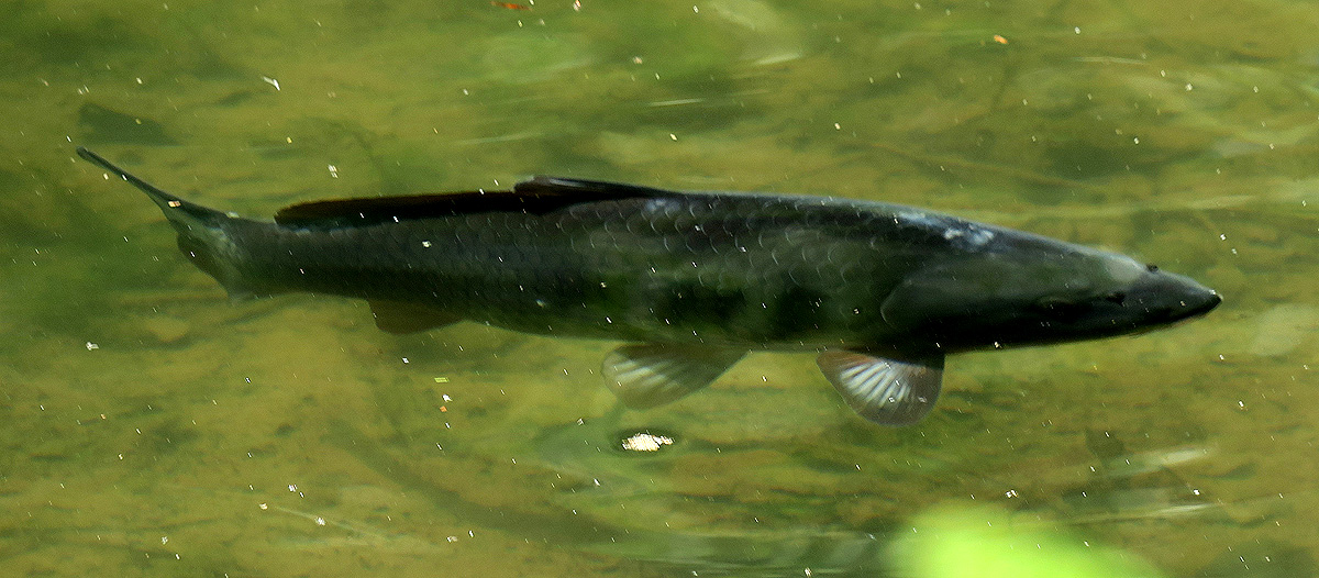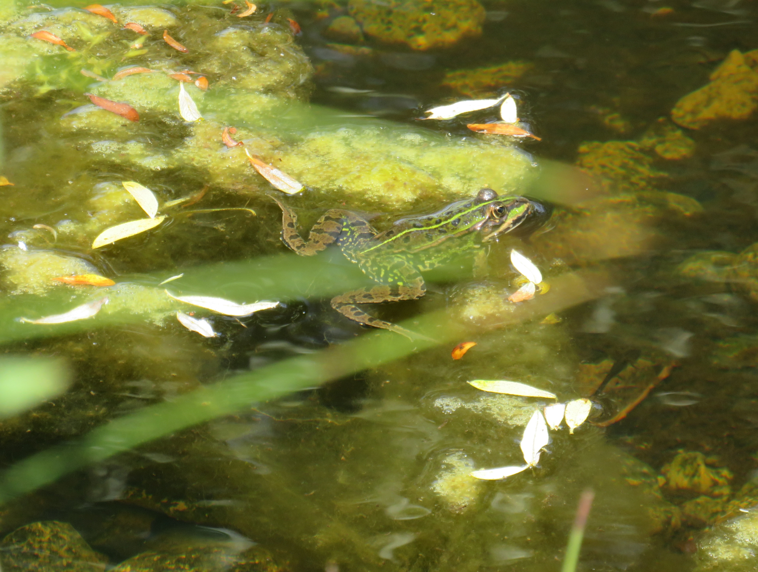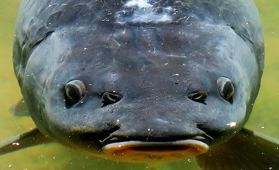 Die Bilder vom 26.06.2022 aus dem Dreiseetal bei Michelstadt zeigen, wie sehr unterschiedlich man ein- und dasselbe Tier fotografieren kann! Im 1. Bild schaut uns der Karpfen frontal von der Wasseroberfläche aus an. Mein Standort war nahe dem Ufer, etwa 0.5 m über der Wasseroberfläche. Im 2. Bild wendet er sich ab. Schräg von oben und noch verstärkt durch die Lichtbrechung der Wasseroberfläche wird er scheinbar zum „Hecht im Karpfenteich“. (Laut Bildnummern war es zwar umgekehrt, aber da nur zwei so große Exemplare sich da herumtrieben, kann ich sicher sagen, dass es sich um dasselbe Tier handelt).