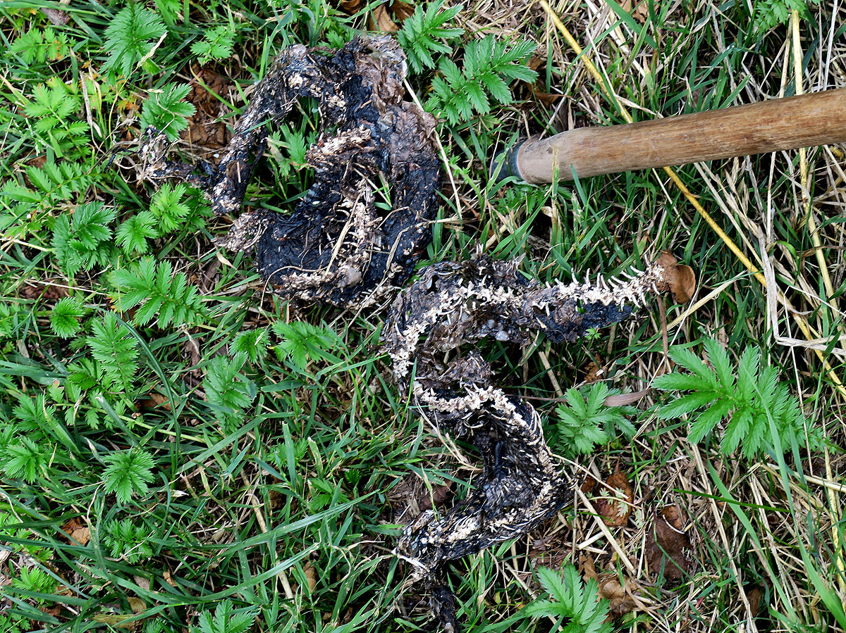 Es handelt sich offenbar um die Reste einer sehr großen Ringelnatter, die hier dem Straßenverkehr zum Opfer gefallen war. Den Wanderstock habe ich als Größenvergleich daneben gesteckt, Durchmesser ca. 2 cm. Morgens legen sich die Schlangen gerne auf den bereits von der Sonne erwärmten Asphaltbelag. Sehr schade!