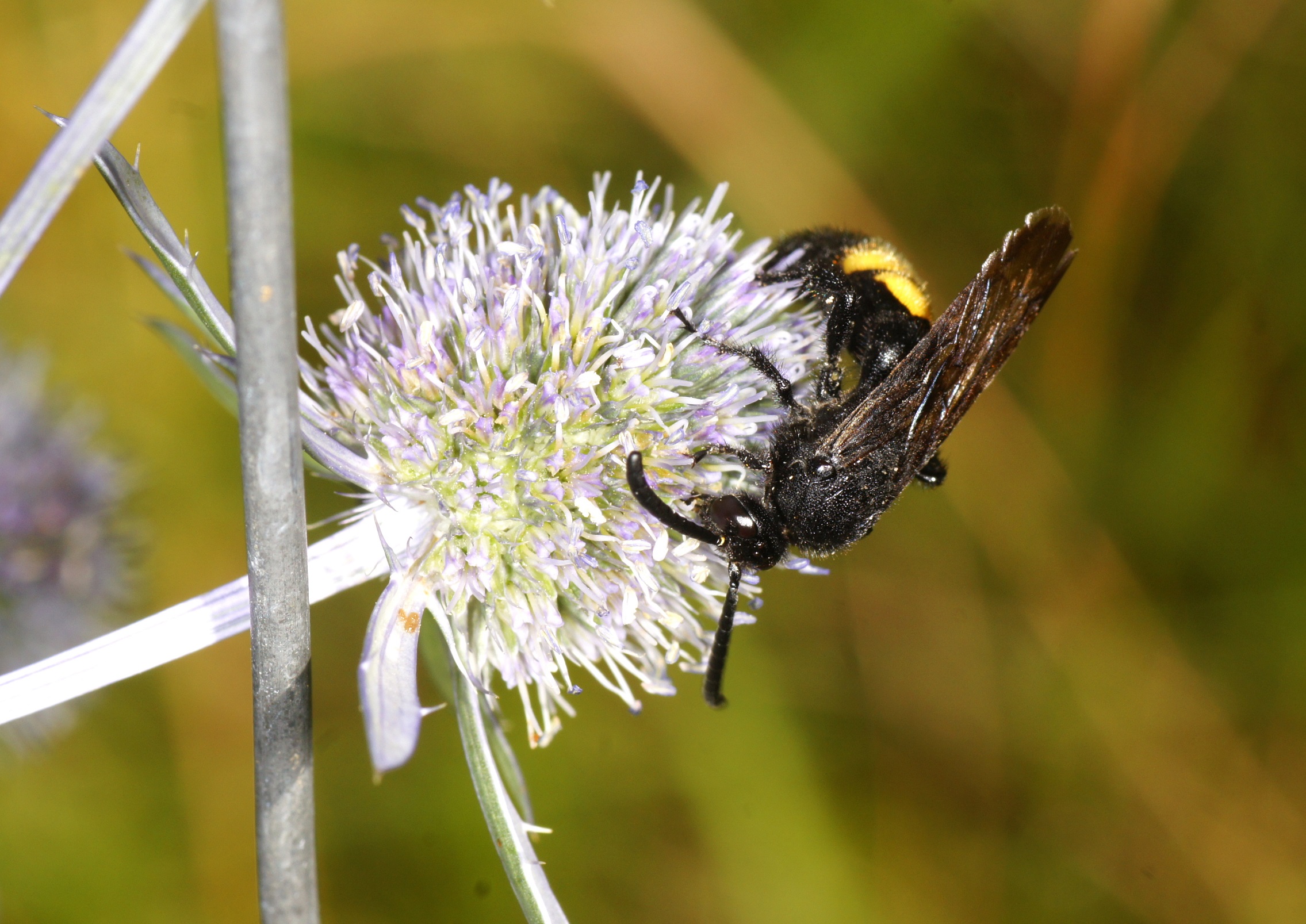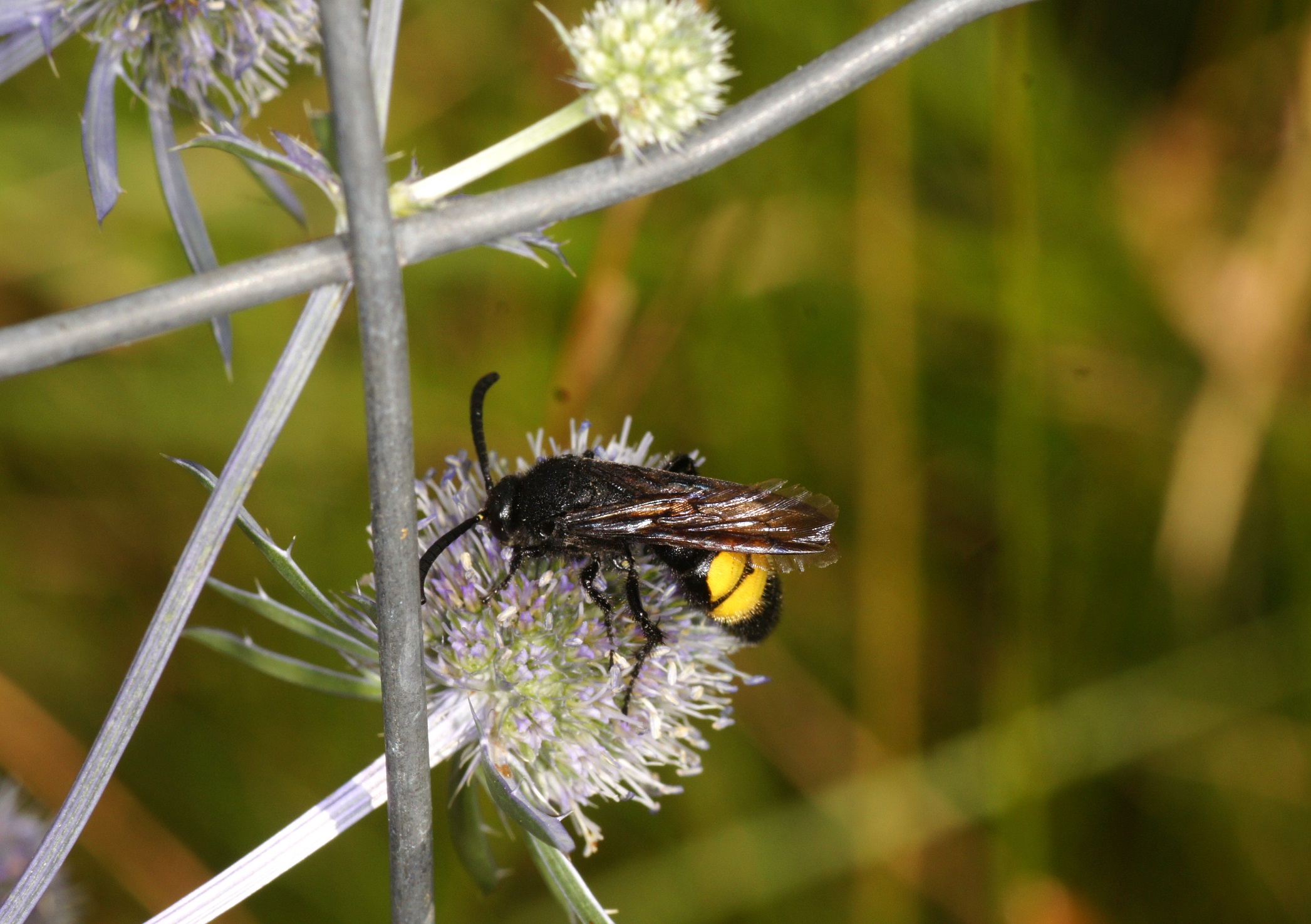 Endlich wieder: Die Dolchwespe Scolia hirta gesichtet. Nicht auf Goldrute wie bisher, sondern auf einer Distel. Die blüht früher und ist für die Wespen erste Nahrung. Die Disteln wurden extra deswegen eingesetzt, weil Dolchwespen diese als Nahrungspflanzen bevorzugen. Im vorigen Jahr gab es auch Scolia sexmaculata im Garten und das immerhin im Stadtgebiet von Klagenfurt. Der teilw. naturbelassene Garten ist da sicher hilfreich! Jetzt warte ich noch auf die viel seltenere sexmaculata!