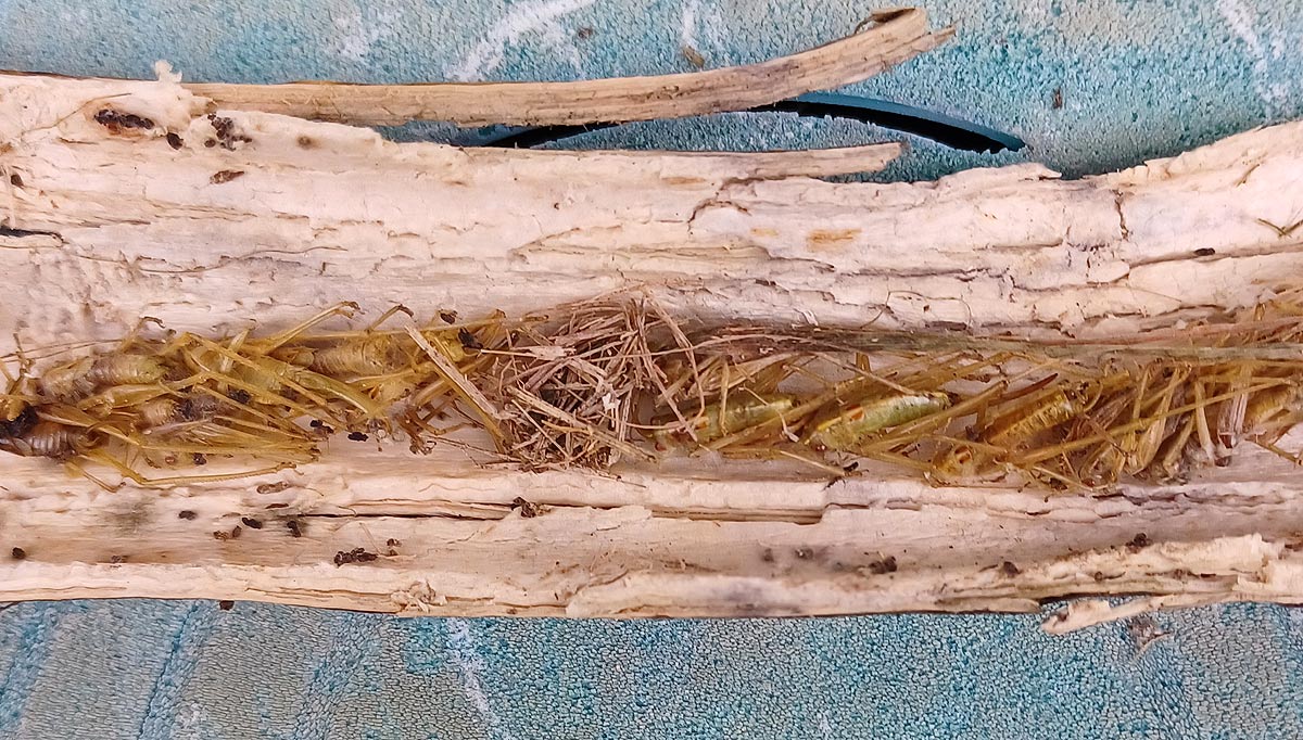 In dieser Röhre lagen drei große Puppenkokons und ein noch frisch grüner Heuhüpfer.