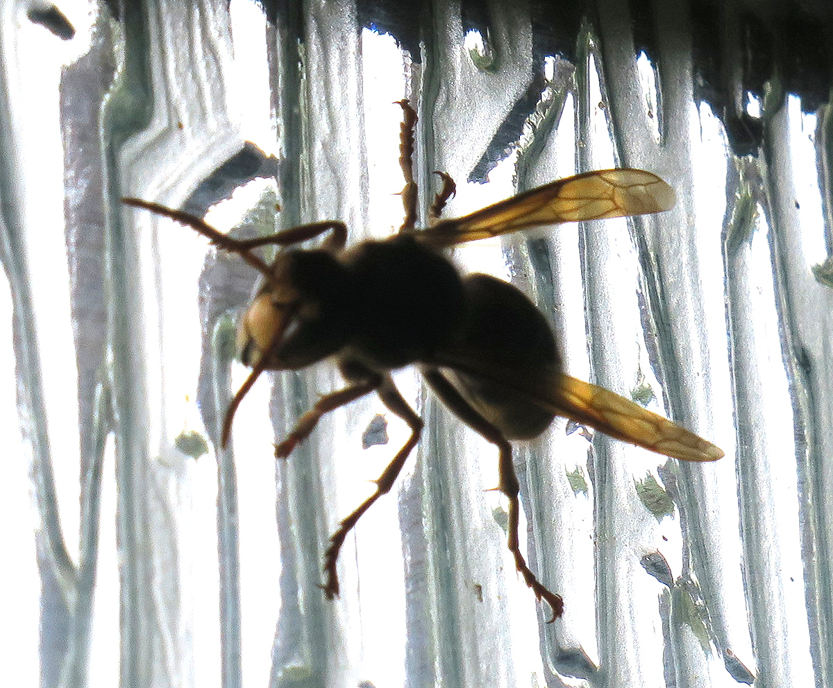 Vespa crabro am Garagenfenster. Im Gegenlicht sieht sie fast schwarz aus