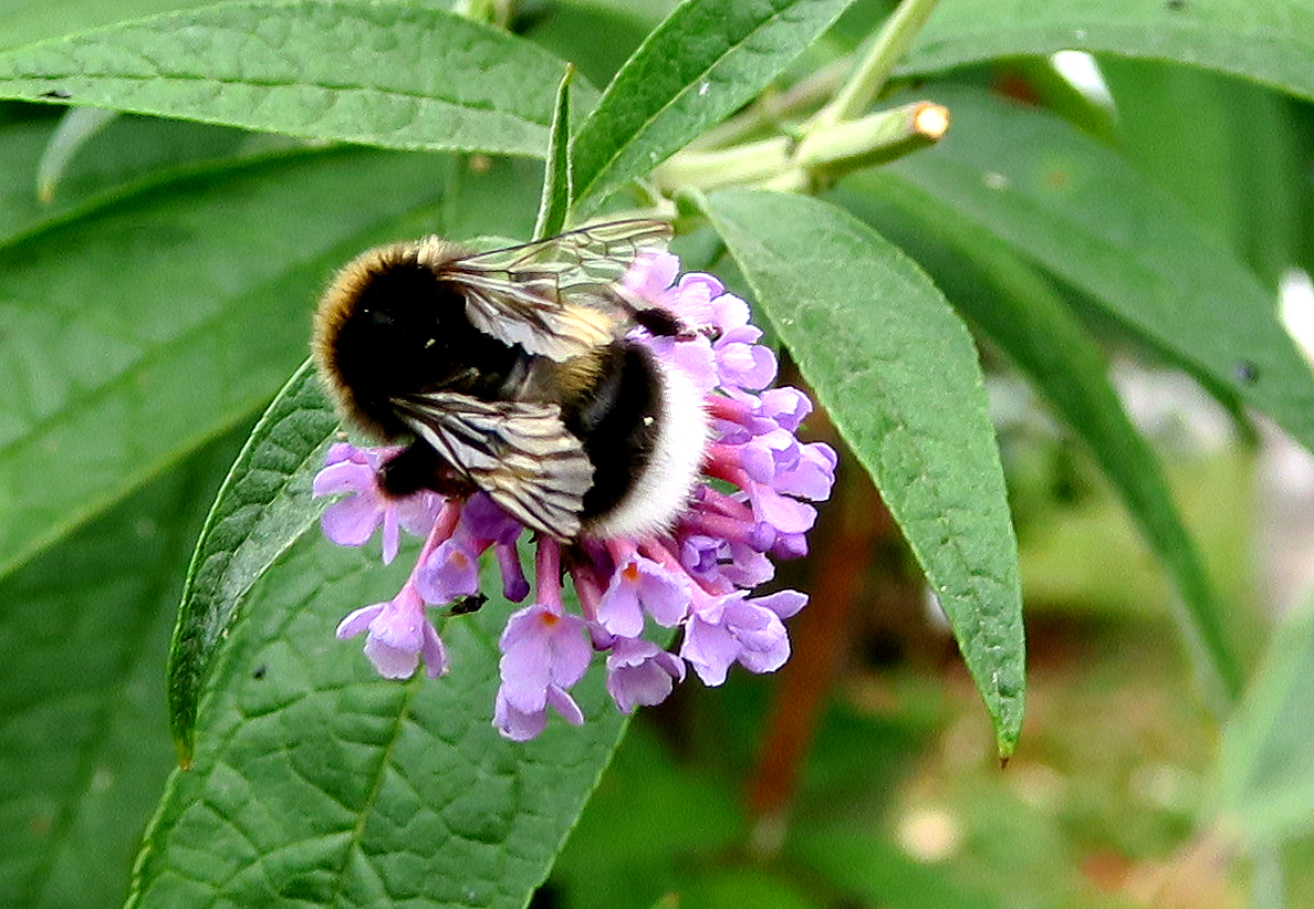 Am nur noch kärglich blühenden Sommerflieder (Buddleia sp.) tankt eine Erdhummel Blütennektar.