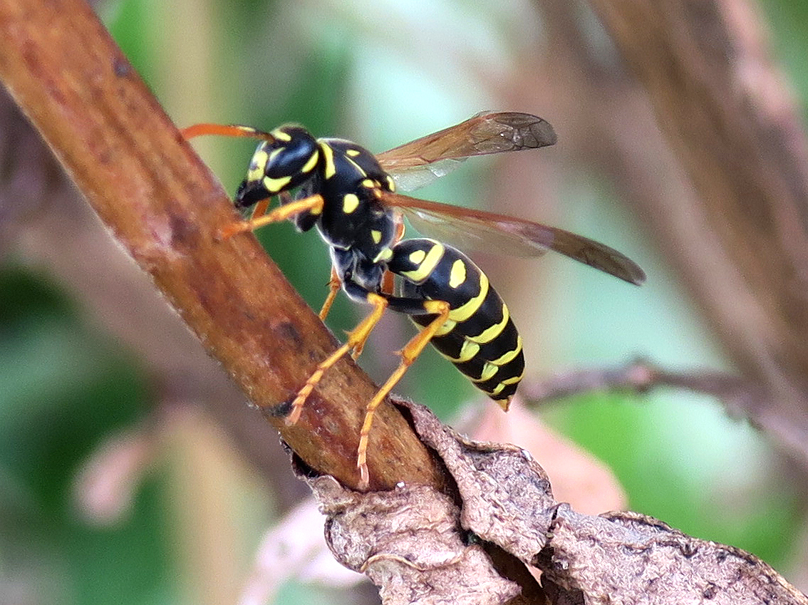Polistes dominula Arbeiterin. Sie scheint an der Borke Baumaterial abzukratzen.