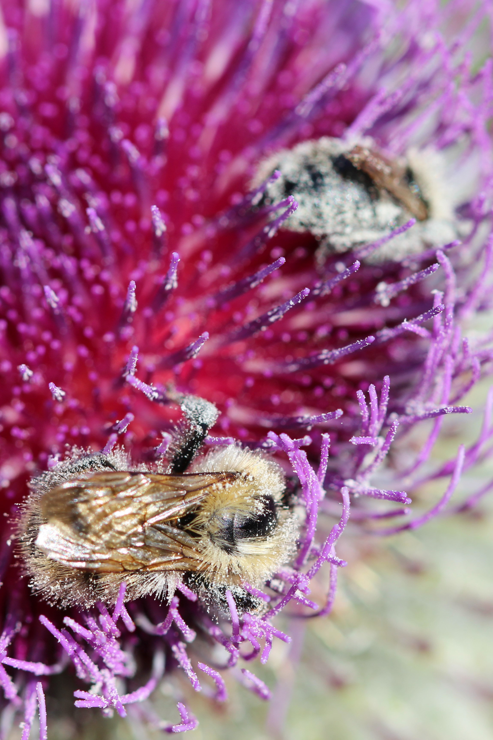 mit zahllosen Honigbienen, die eifrig Pollen höseln.