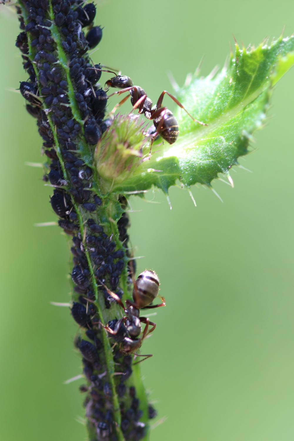 An der Pflanze gibt es auch Honigtau von Blattläusen. Formica (Serviformica) fusca inspiziert reihum die Blätter nach süßen