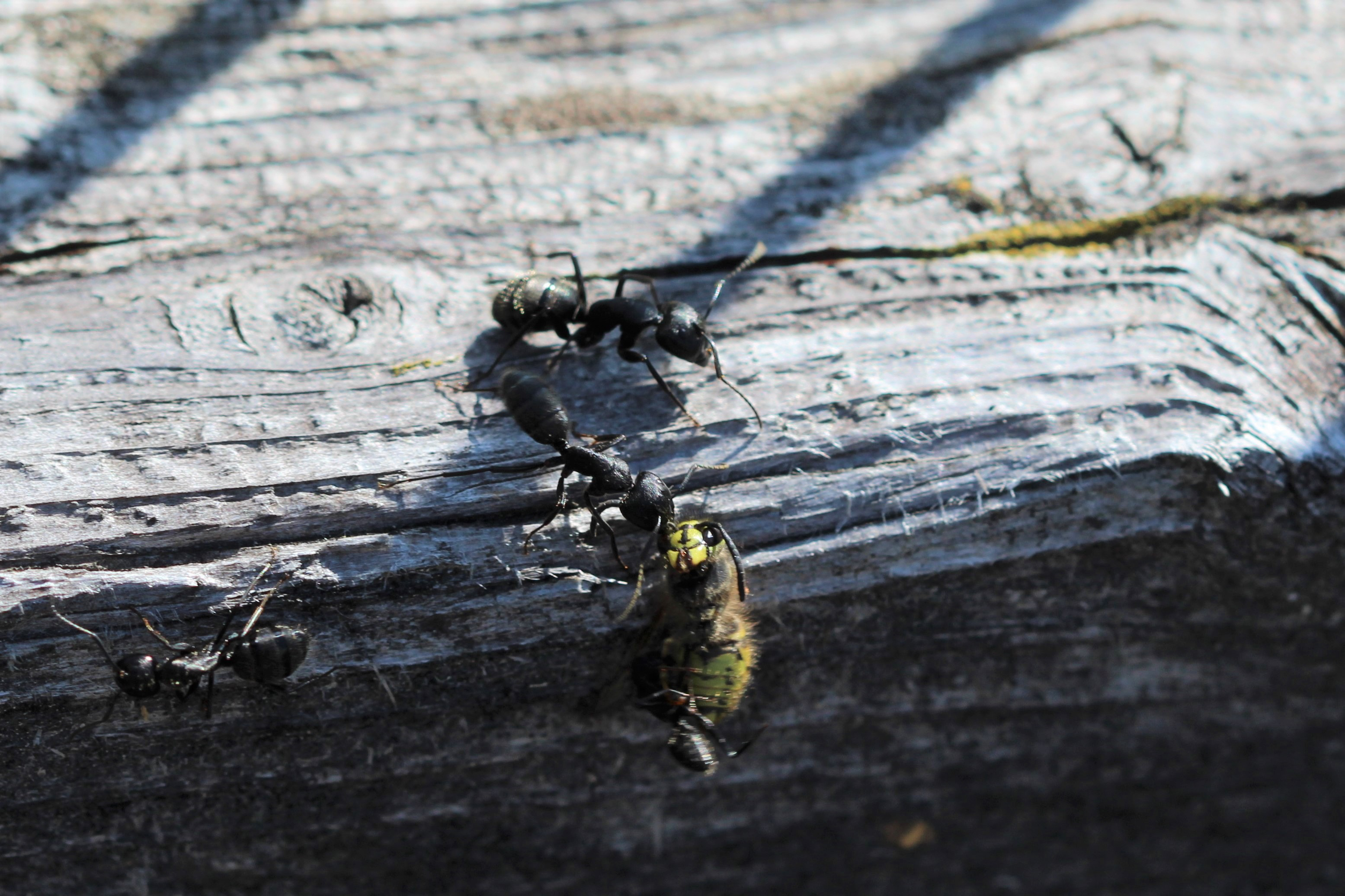 Diese Vespula vulgaris hat sich für ihre letzte Reise besondere "Fährmänner ausgesucht". Camponotus vagus benützen eine Holzbrücke als Strasse über einen reissenden Fluss.