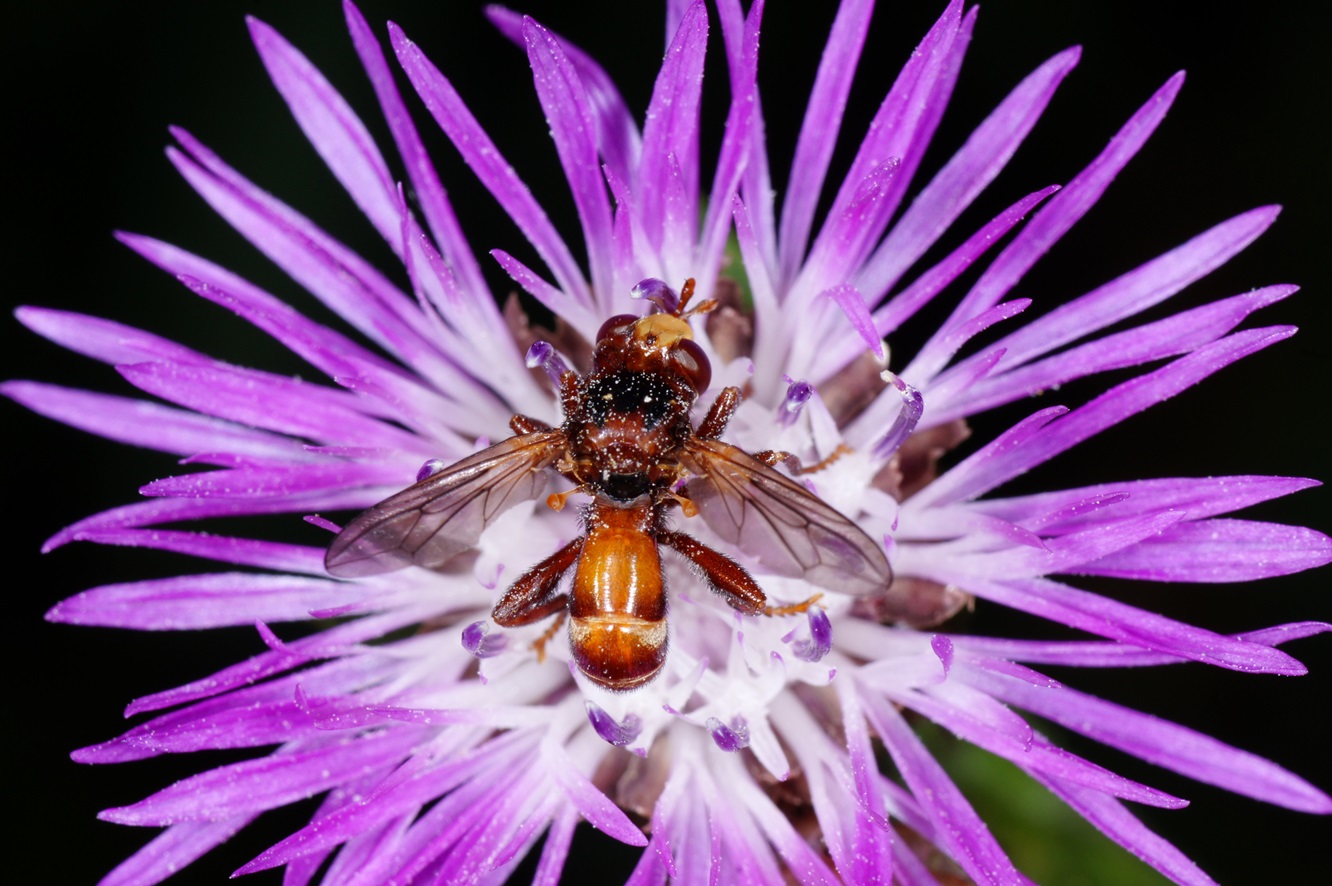 Eine bunt gefärbte Fliege, die ich bisher nicht genau zuordnen konnte! Sollte zu den Blasenkopffliegen (Conopidae) gehören.