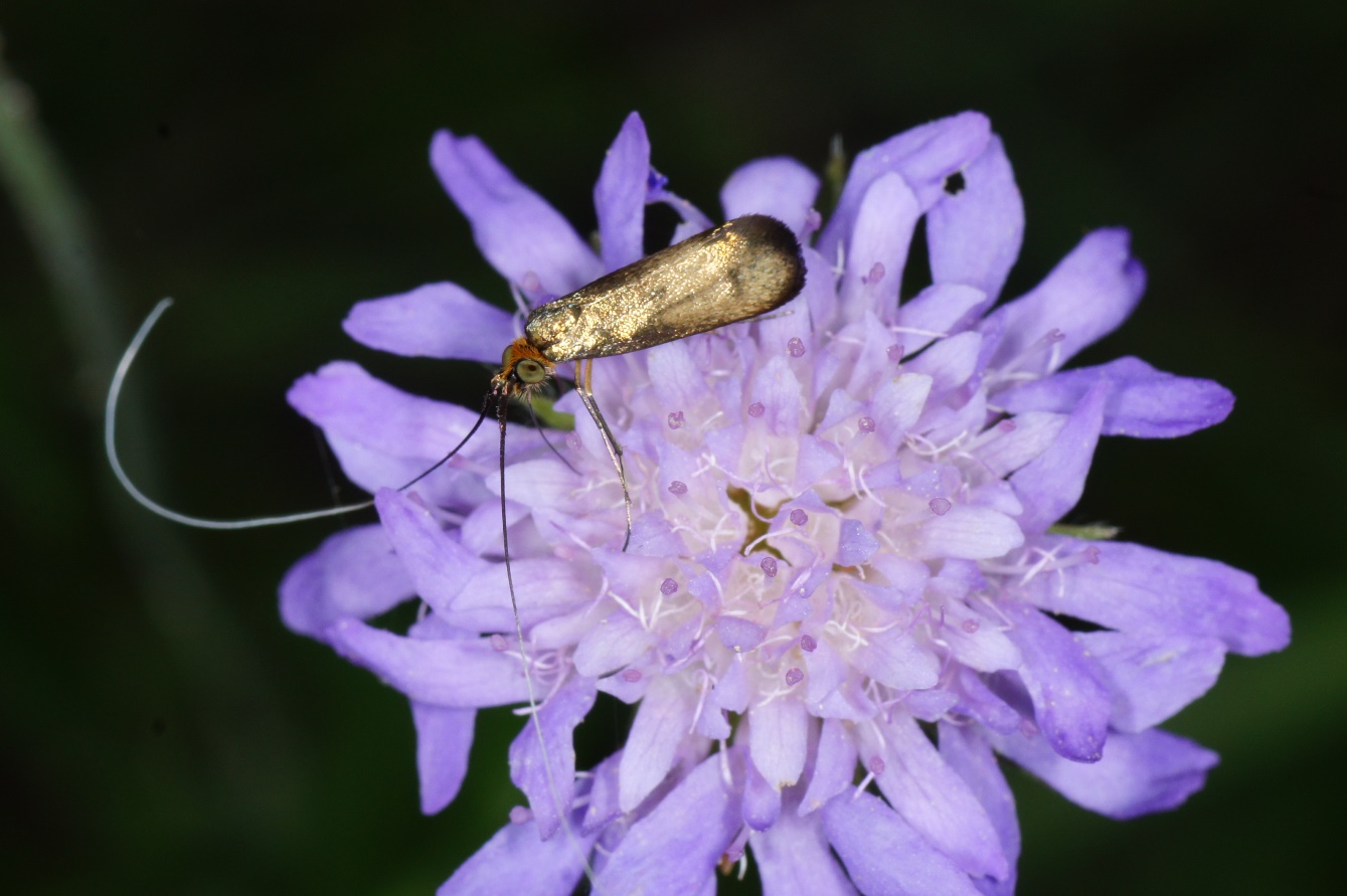Ein wunderschönes, golden schimmerndes Insekt: Nemophora metallica, die Skabiosen-Langhornmotte.