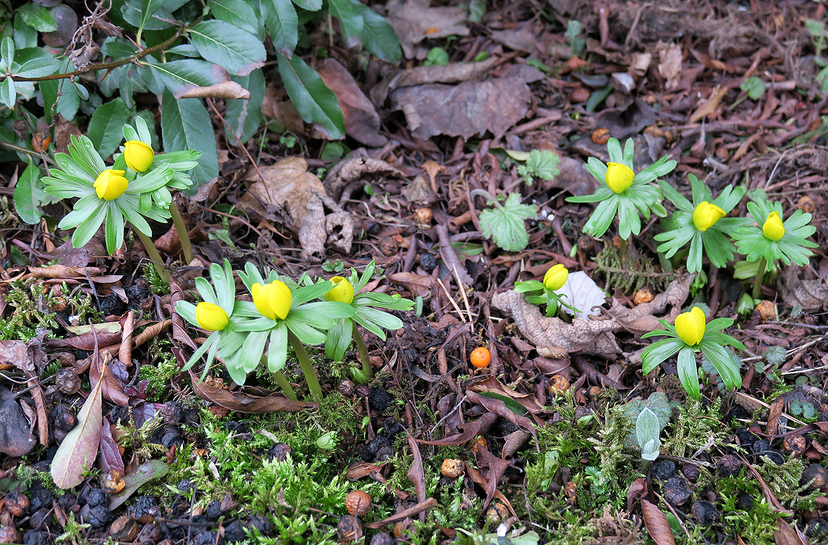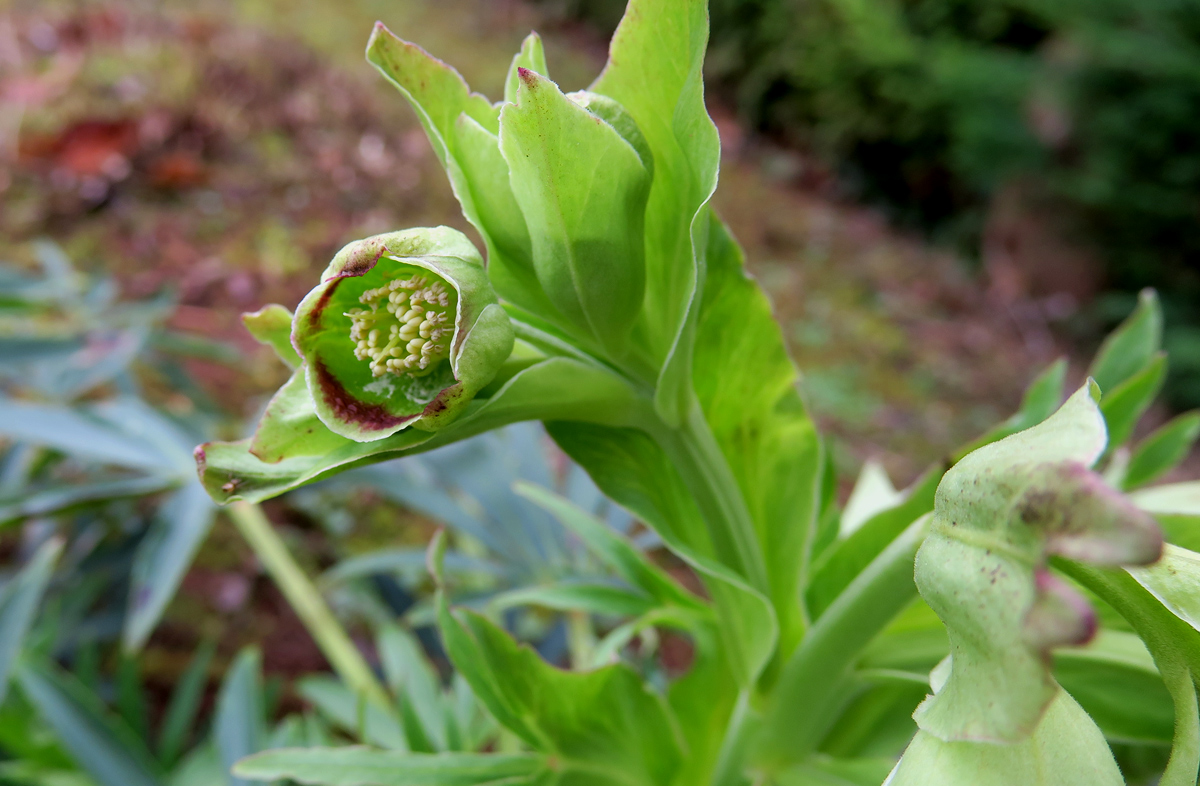 Helleborus sp., Zuchtformen), und rechts eine einheimische junge Seidelbastpflanze (