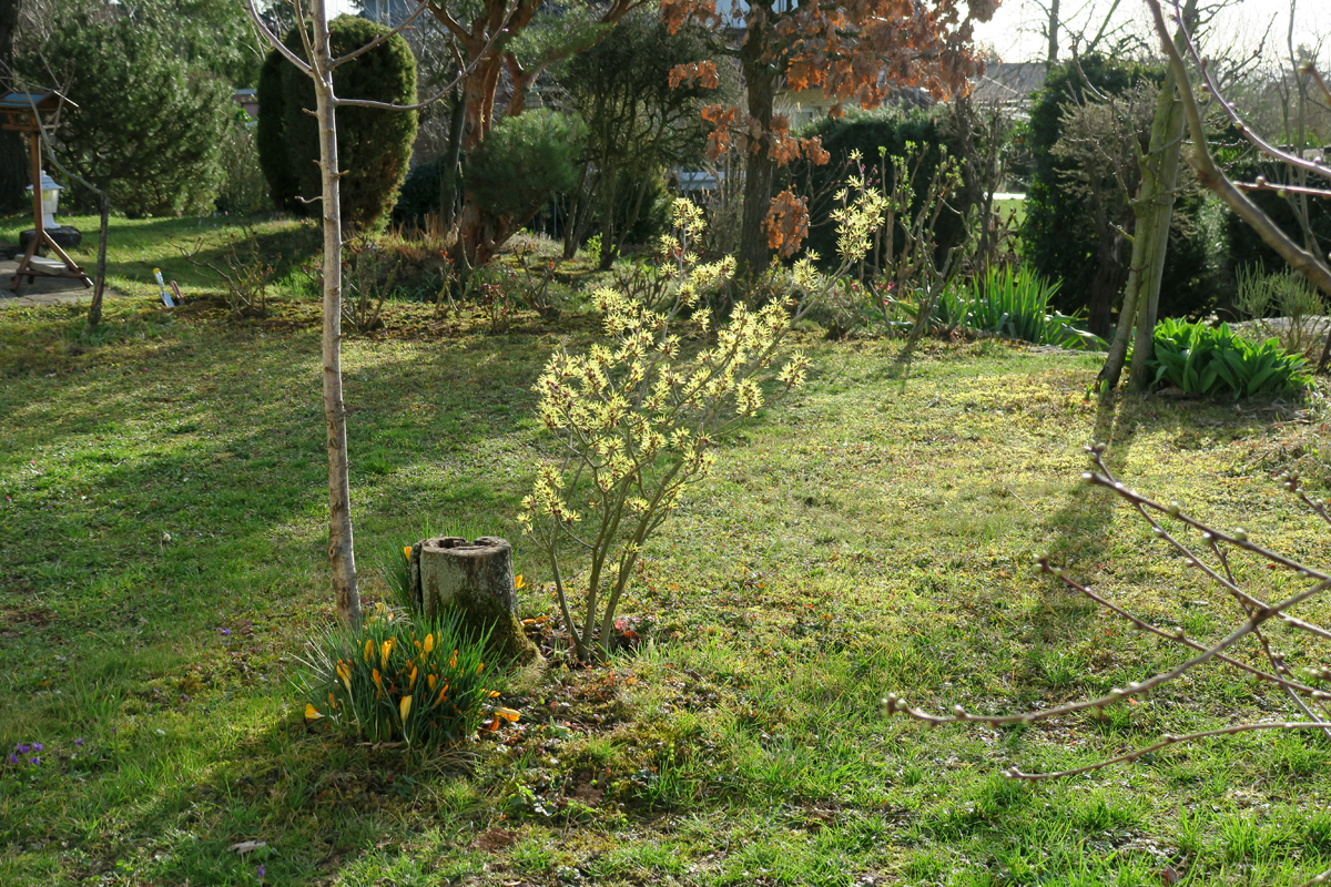 Die Zaubernuss ist nicht heimisch, aber sie erfreut durch frühe und lange Blüte. Die üppigen gelben Krokusse davor sind bereits weitgehend abgeblüht.
