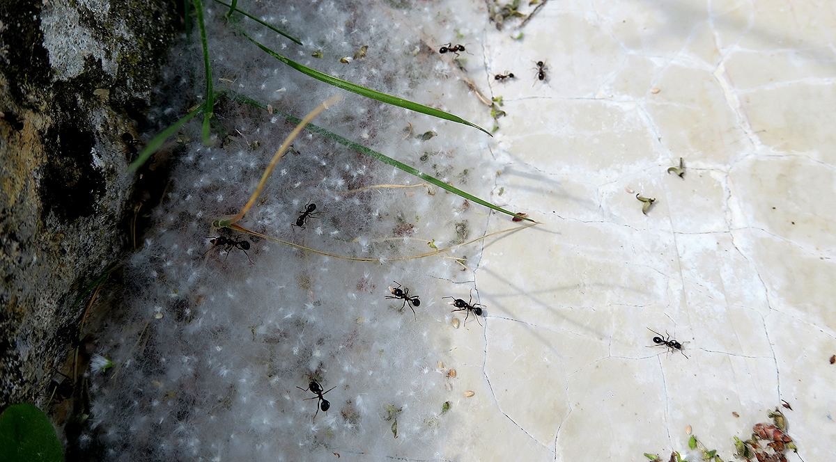 angesammelt. Das watteähnliche, weiche und vom Wind immer wieder umgelagerte Material verdeckt die Ameisenstraßen und alle eventuellen