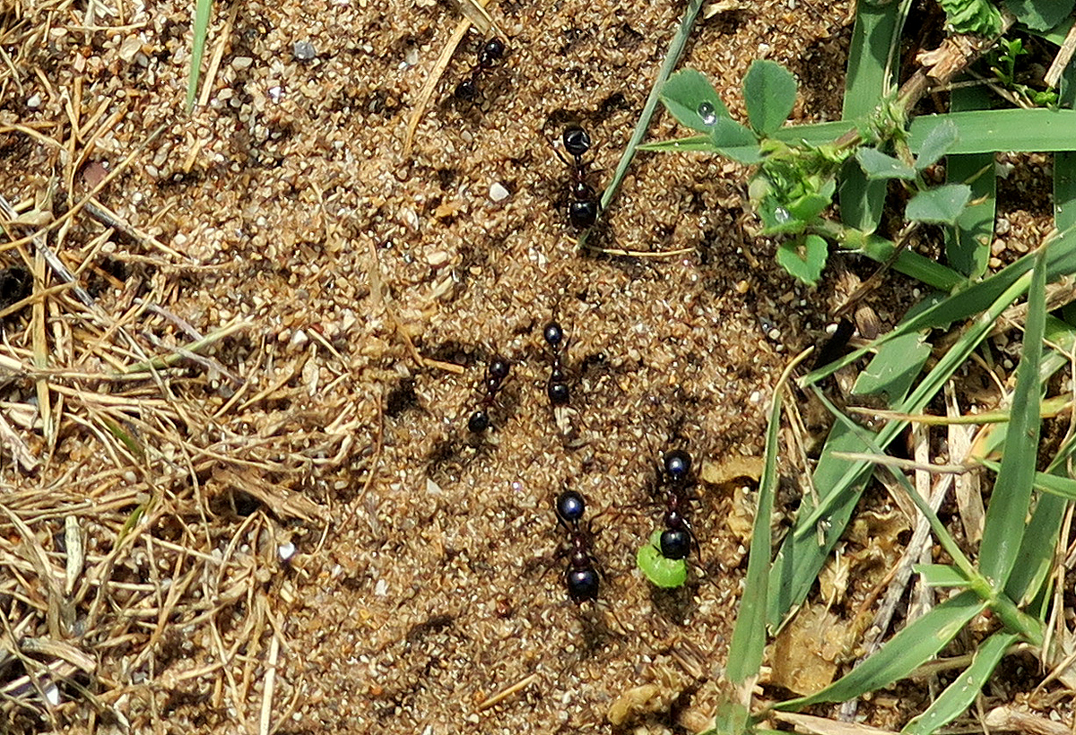 Am 10. 4. gelang es mir, auf einer Straße eine Messor-Arbeiterin zu fotografieren, die eine kleine, hellgrüne Raupe Richtung Nest trug (unten rechts).