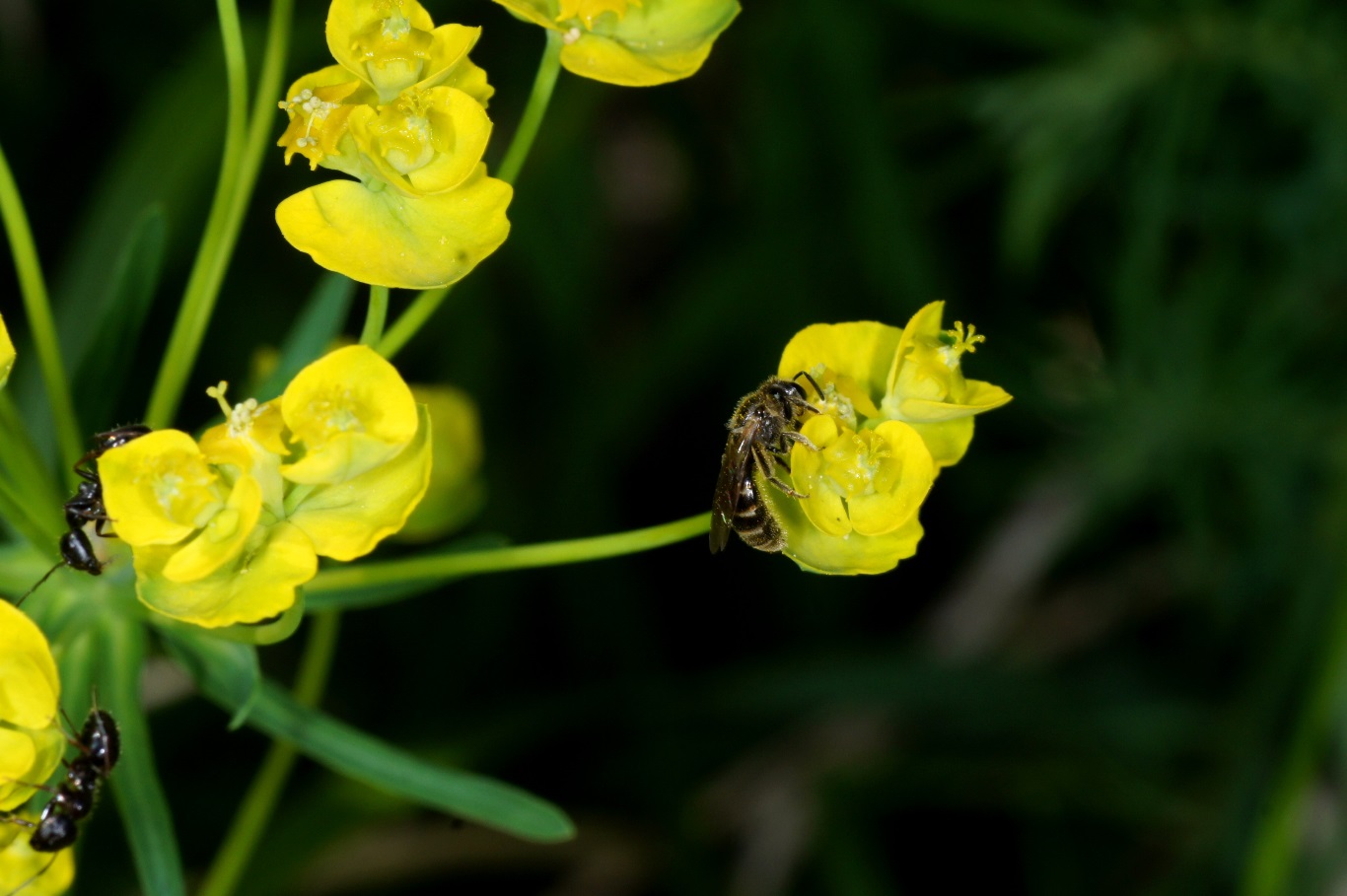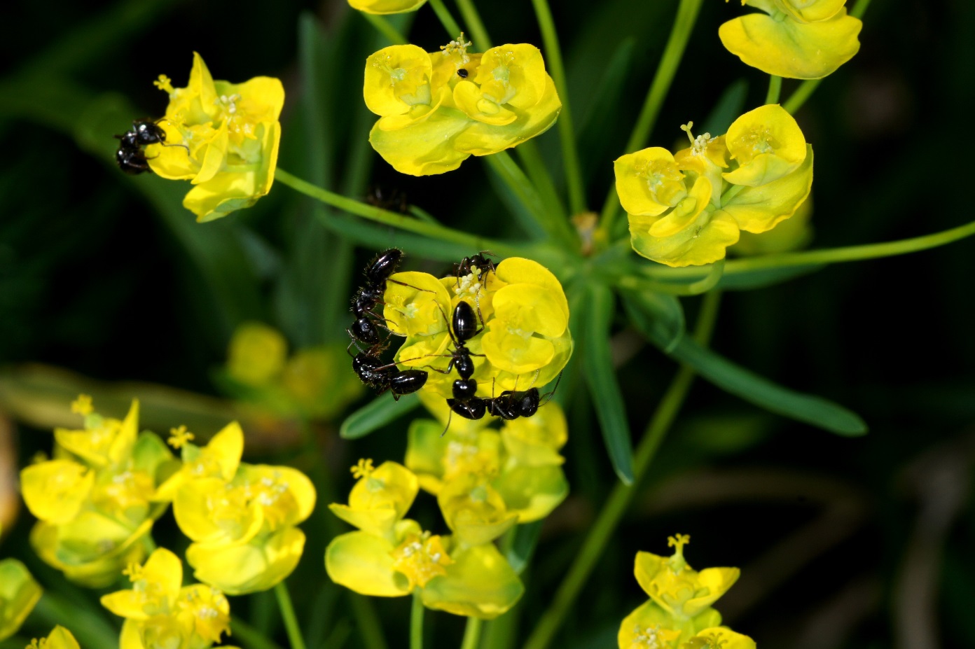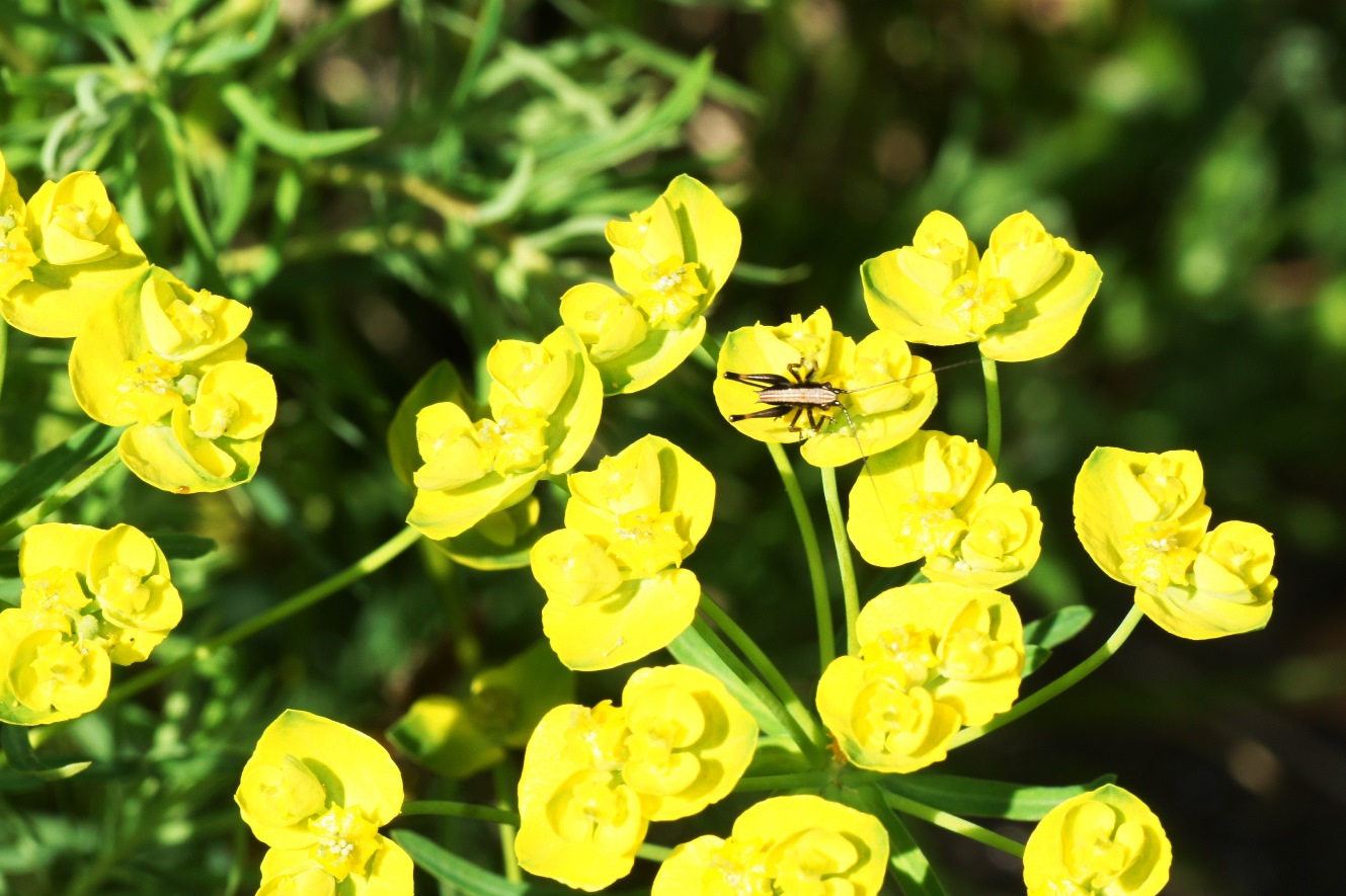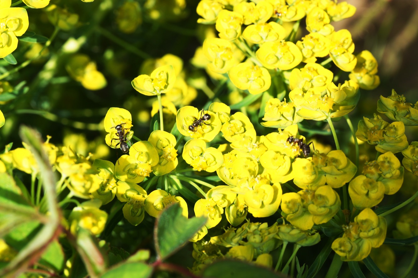 Einige Wolfsmilchgewächse sind für Ameisen und andere Insekten sehr interessant. Die auf den Fotos sichtbare Wolfsmilch wächst auf Ruderalflächen, Wegrändern, Steingärten usw. Wenn sie nicht dem extremen Eifer der meisten Gartenbesitzer durch penibles Jäten zum Opfer fällt, vermehrt sie sich gut und wird teilweise invasiv. Das stört mich aber nicht, wichtig sind die Ameisen und anderen Insekten.
