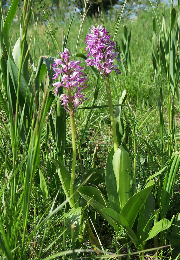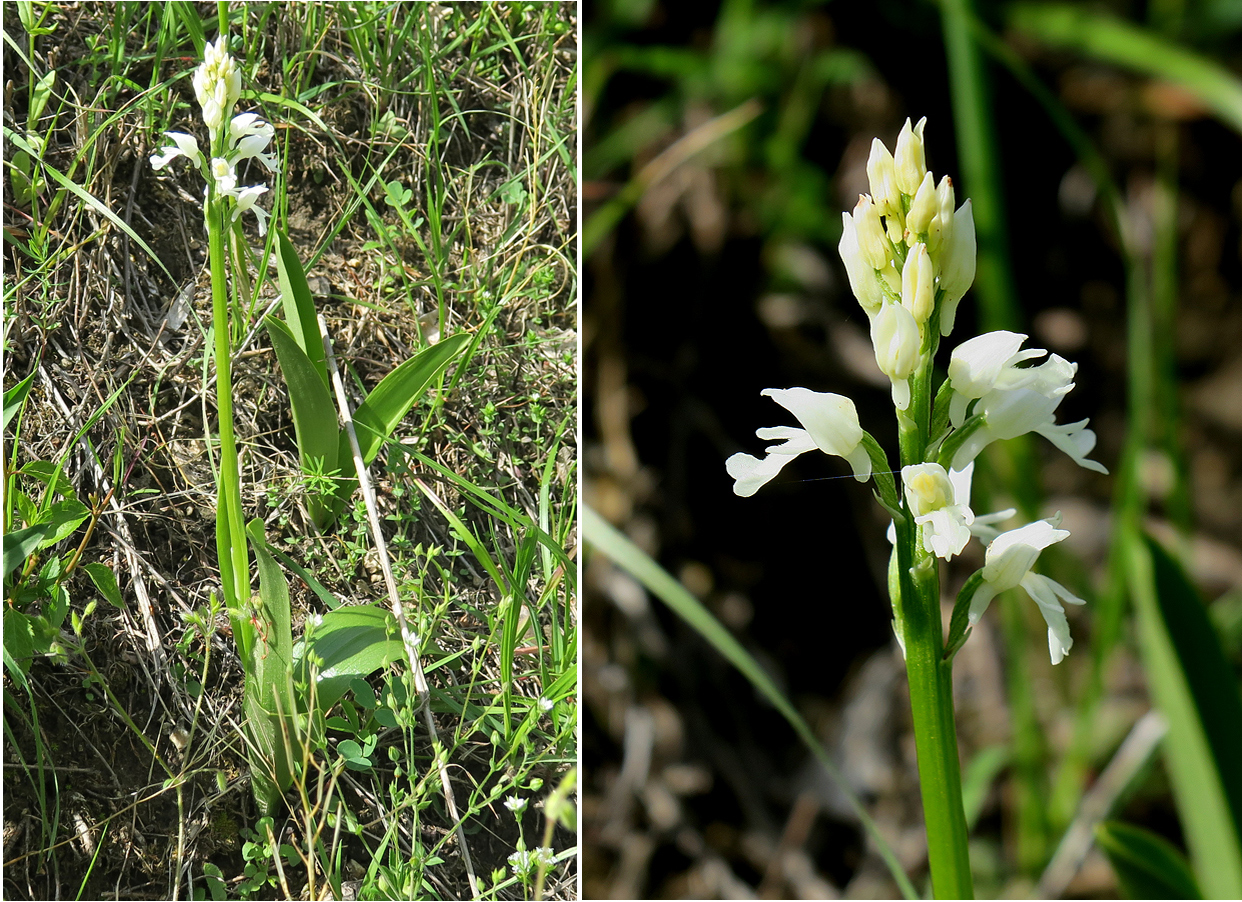 Überraschend entdeckten wir neben den normal gefärbten Orchis militaris ein rein weiß blühendes Exemplar.