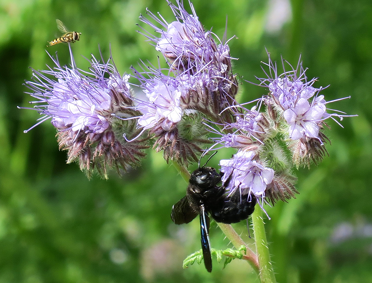 im Totholz Brutkammern auszunagen. Hier besucht eine auch die Bienenweide. Zufällig kommt (links oben) auch noch eine Schwebfliege dazu.