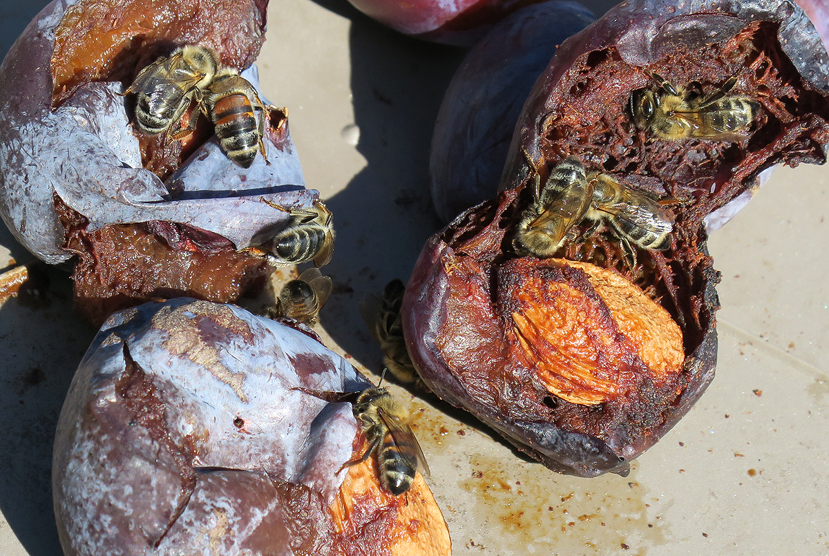- Jedenfalls sieht man überall unter Pflaumenbäumen sowohl die Falter als auch Honigbienen eifrig an dem abgefallenen Obst nuckeln.