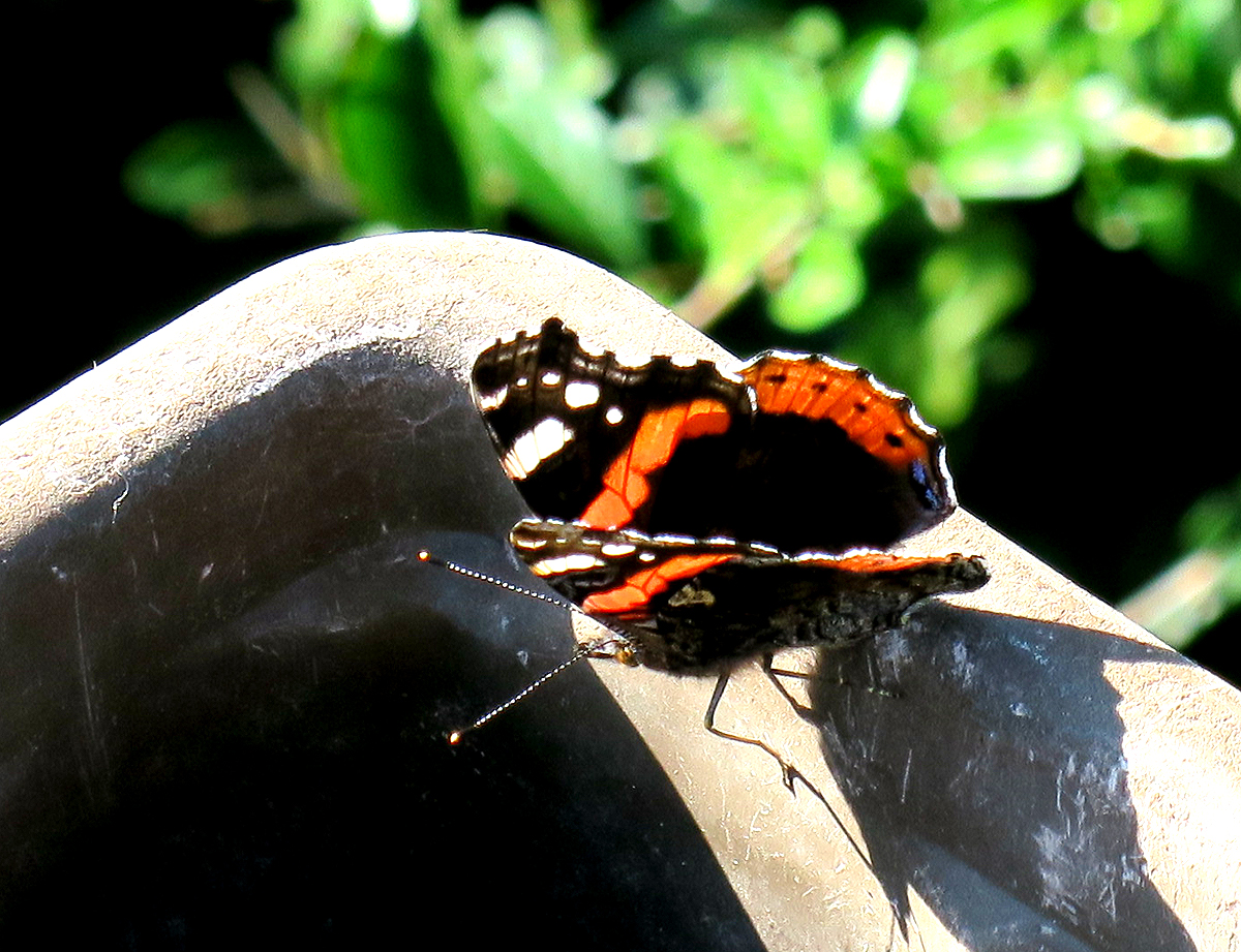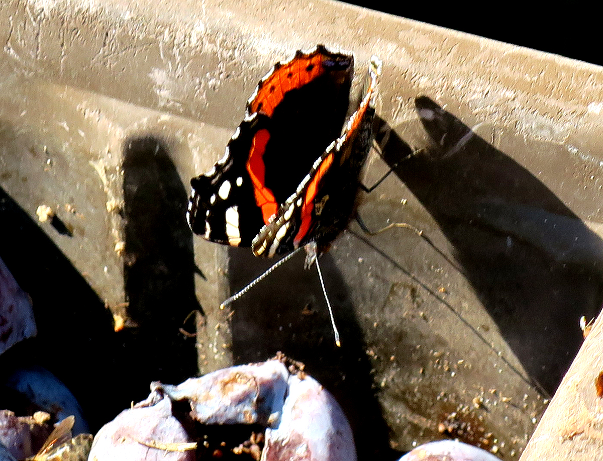 Tagpfauenauge, Distelfalter, und ein ganz frischer, wunderbar gefärbter Admiral fanden sich dieser Tage schon am Futternapf ein.