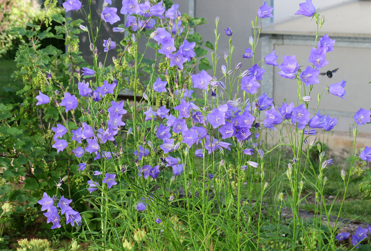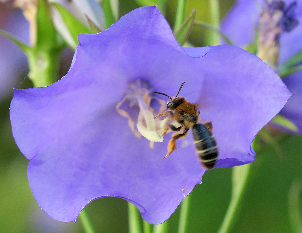 Im Garten blüht die Pfirsichblättrige Glockenblume. Für diverse Bienen ist sie sehr attraktiv. Rechts oben entzieht sich eine Holzbiene (Xylocopa violacea) dem Objektiv.