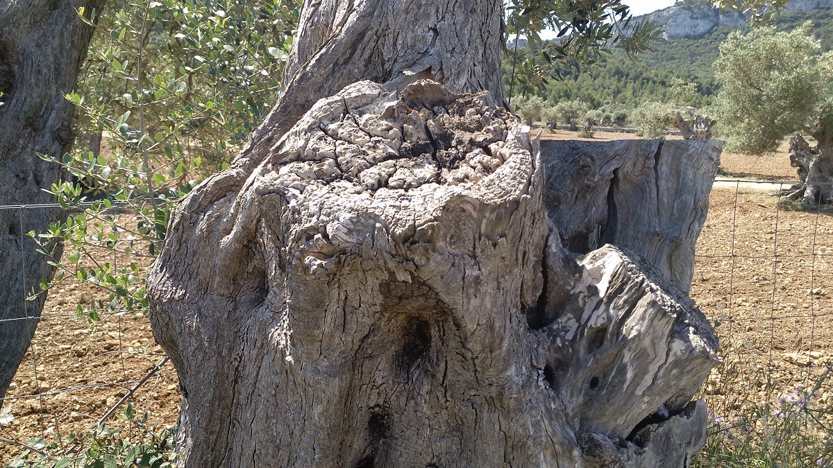 Sechs bis sieben Xylocopa-Weibchen nisten in dem Stubben. Drei sichtbare Nesteingänge sind rot markiert.
