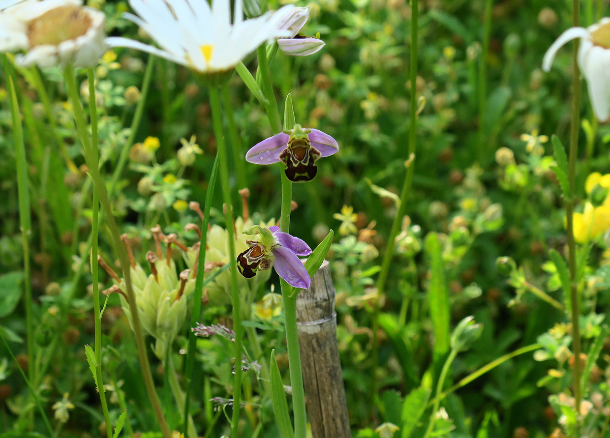 Auch zwischen den Margueriten hat sich seit 2029 die einheimische Orchidee Ophrys apifera, Bienen-Ragwurz, in mehreren Exemplaren angesiedelt. Jetzt blüht sie wieder.