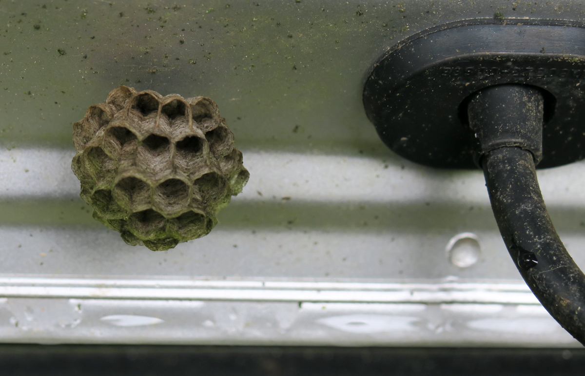 Unter der geöffneten Heckklappe eines Kia Picanto entdeckten wir gerade dieses Polistes-Nestchen.