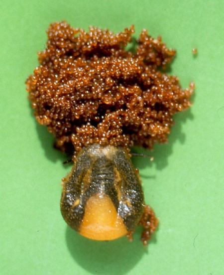 Nachdem hier gerade ein Fernsehbeitrag angekündigt wurde, in dem es auch um Zecken geht, viewtopic.php?f=23&t=131&p=4710#p4703 , stelle ich mal dieses Bild ein, das die enorme Vermehrungskapazität dieser Tierchen dokumentiert. Es sollen 1.000 bis 3.000 Eier sein. Das Hinterende ist im Bild unten; die Geschlechtsöffnung findet sich ventral ziemlich weit vorn, so dass die Eier nach vorn abgegeben werden.