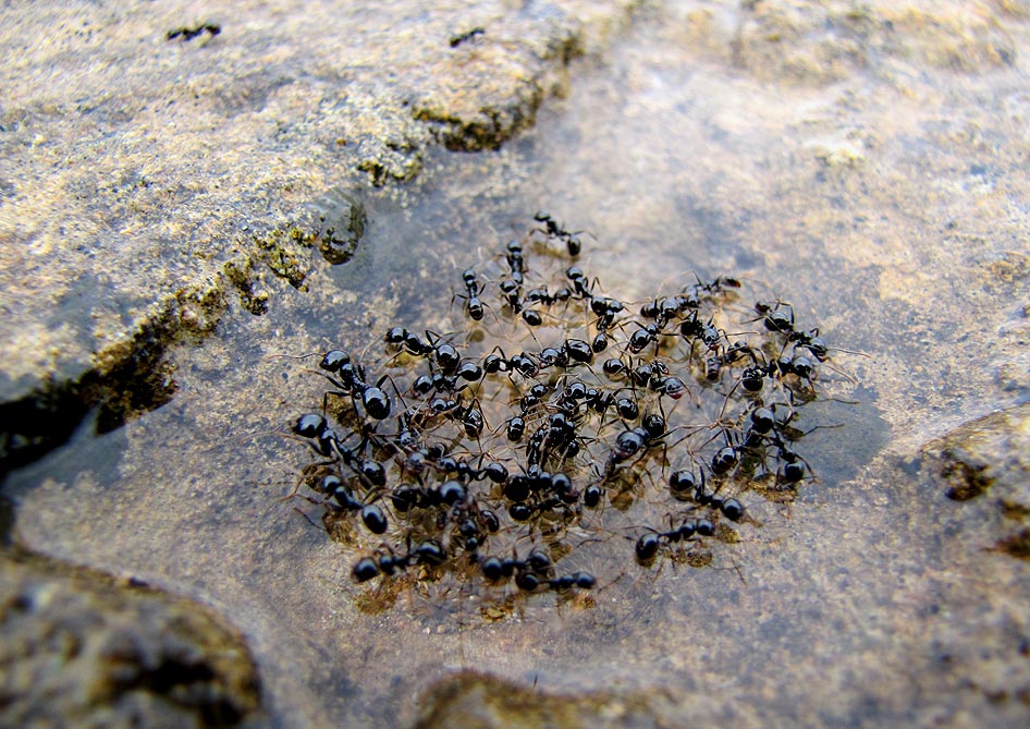 (Natürlich waren die Arbeiterinnen nicht freiwillig in der Pfütze; sie wurden wohl durch die Adhäsion auf der Wasseroberfläche festgehalten. Das Wasser war kurze Zeit später versickert bzw. vertrocknet, so dass sie wieder ihren normalen Tagesgeschäften nachgehen konnten).