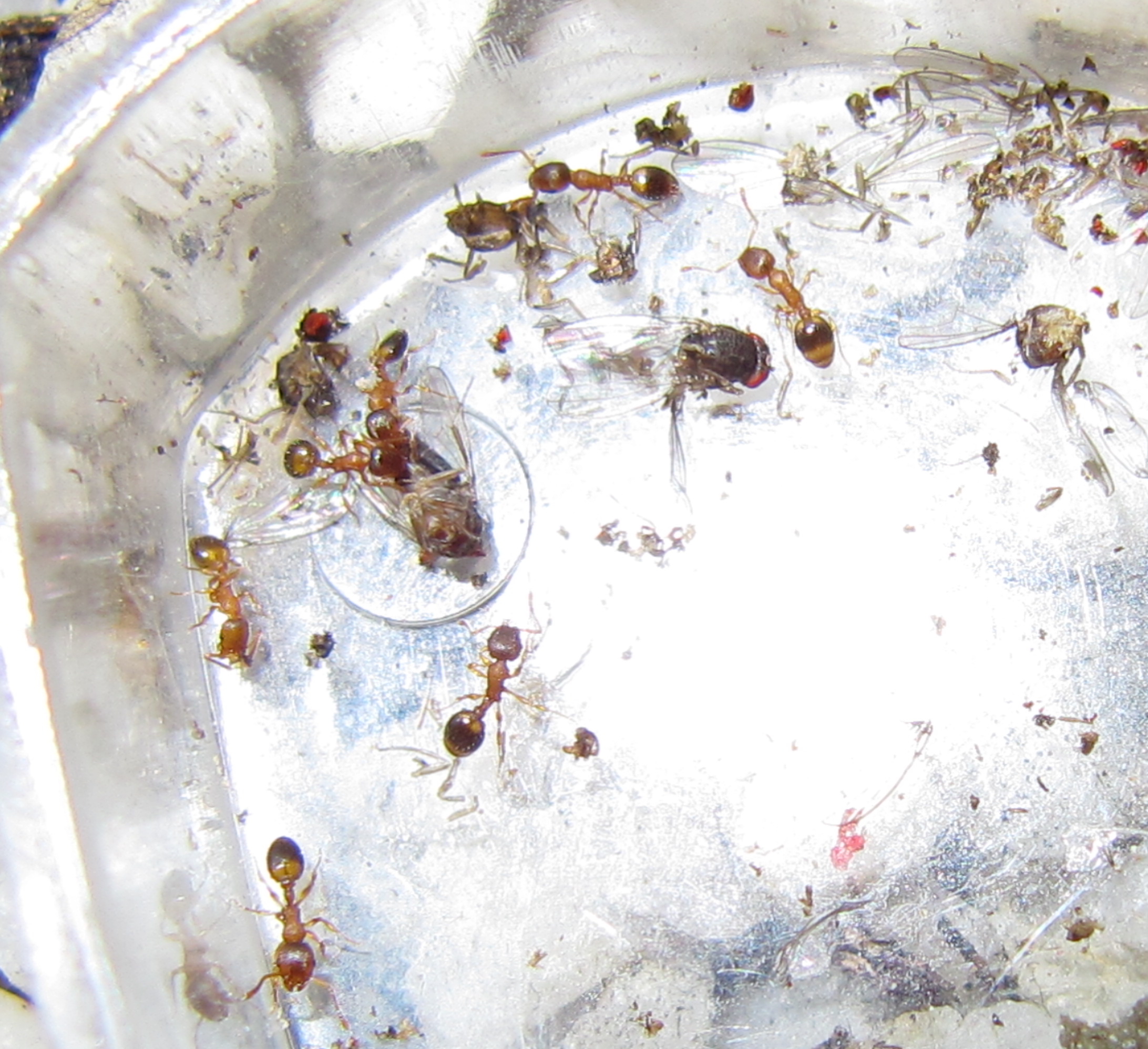 Die Winzlinge von Temnothorax nylanderi haben nicht gerade den Ruf, zu den interessantesten Ameisen in der Haltung zu gehören. Und natürlich, mit dem "Wuselfaktor" einer Lasius niger Kolonie können die herzigen Tierchen echt nicht mithalten. Wenn ihr Halter allerdings 10 Tage lang keine Proteine mehr füttert, weil er denkt die Ameisen hätten bereits auf Winterruhe umgetellt und füttern ihre Larven nicht weiter - aber dann anschliessend doch Fruchtfliegen anbietet, kann man auch bei Temnothorax "Massenmobilisierung" und Teamwork beobachten:
