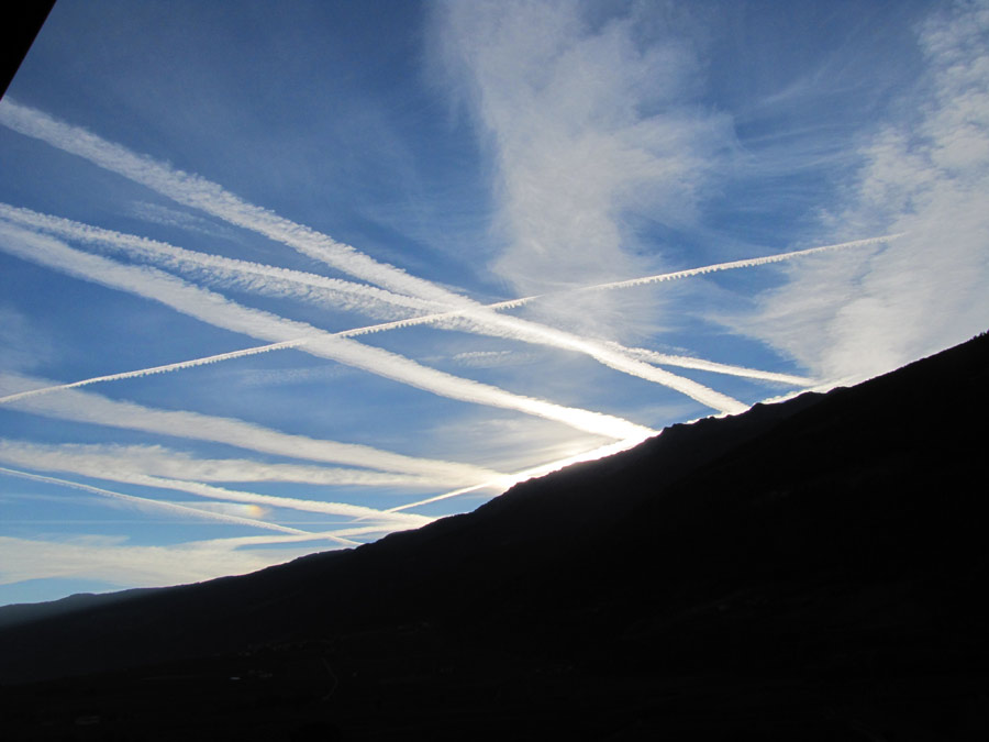 Kondensstreifen über Südtirol, Nähe Meran, am 19. 10. 2014 um 07:56. An jedem Morgen mit südlich -"blauem" Himmel waren sie zu beobachten.