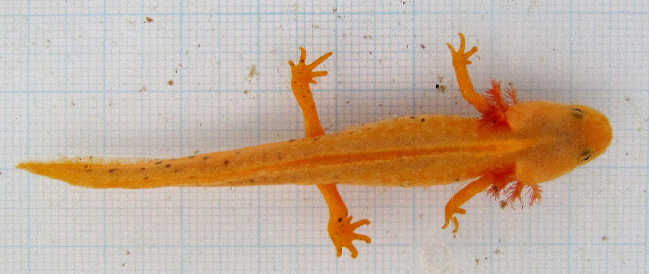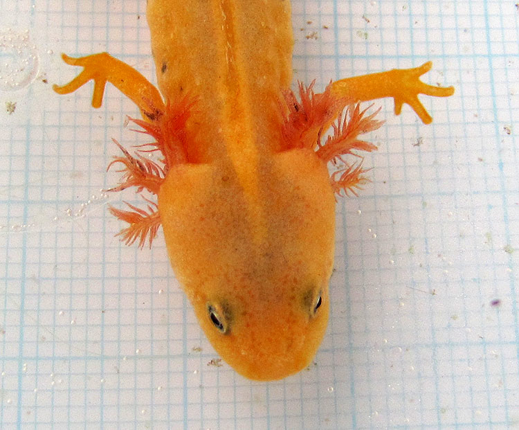 Obwohl ich über das Kerlchen schon wiederholt berichtet habe, so ist es mir heute einen weiteren Eintrag wert: Gegen 15:30 sah ich das leuzistische, neotaenische Exemplar mal wieder im Teich, konnte es heraus fangen und fotografieren!