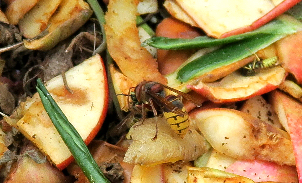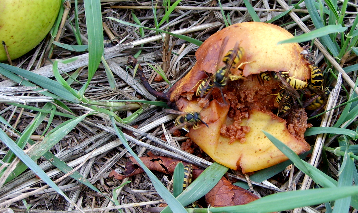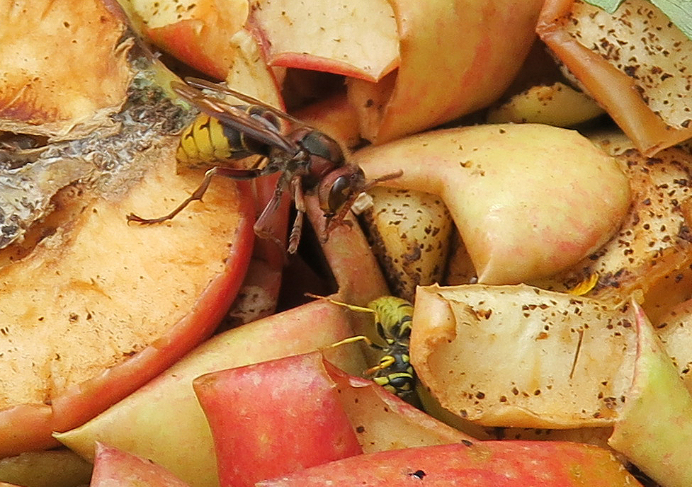 Wir haben heuer zahllose „Gemeine“ und „Deutsche Wespen“ im Garten. Besonders attraktiv sind die Apfelreste auf dem Kompost: Zeitweilig schwirren