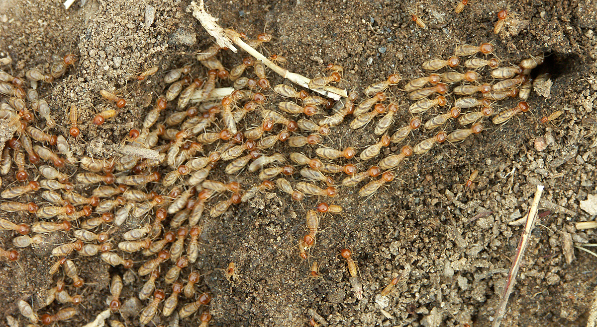 Kaum hat man die schützende Steinplatte abgehoben, flüchten die Termiten erstaunlich koordiniert zu einem Loch, das tiefer in den Boden führt.