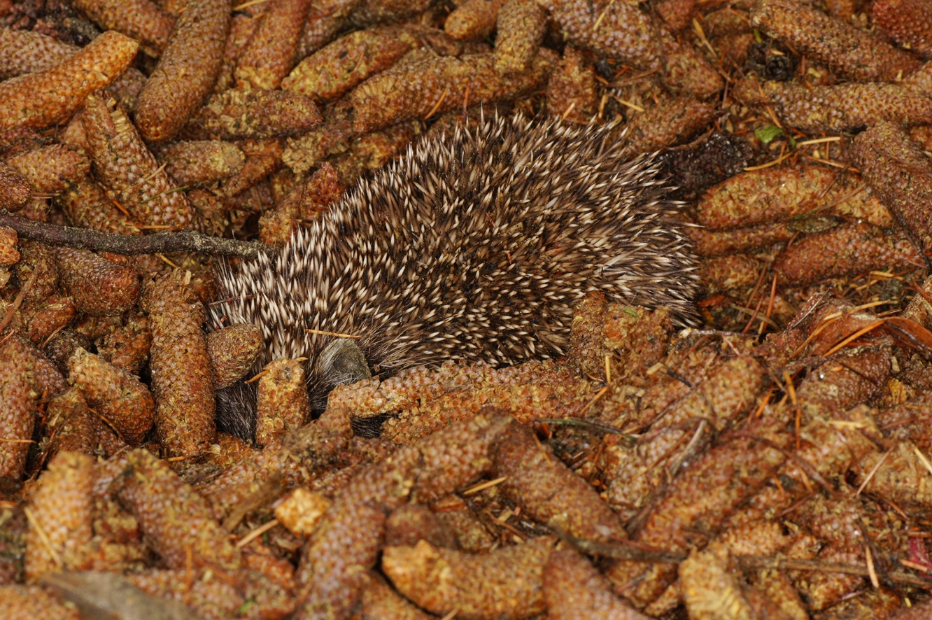 Vor 2 Tagen habe ich die jetzt massenhaft herunterfallenden männlichen Blüten meiner Atlaszeder am Gehsteig außerhalb des Grundstückes zusammengekehrt und dann kübelweise in die Bio-Tonne befördert. Dabei habe ich etwas übersehen, das habe ich dann einen Tag später in der Tonne (zum Glück) entdeckt: Ein kleiner, quicklebendiger Igel, vielleicht 11-12 cm lang. Beim Einsammeln des Materials hat er sich offenbar totgestellt, sodass ich ihn nicht entdeckt habe. Ob der Kleine bei seiner Größe den Winter überlebt, weiß ich nicht. Er wurde gerettet und gleich mit Hundefutter ernährt.