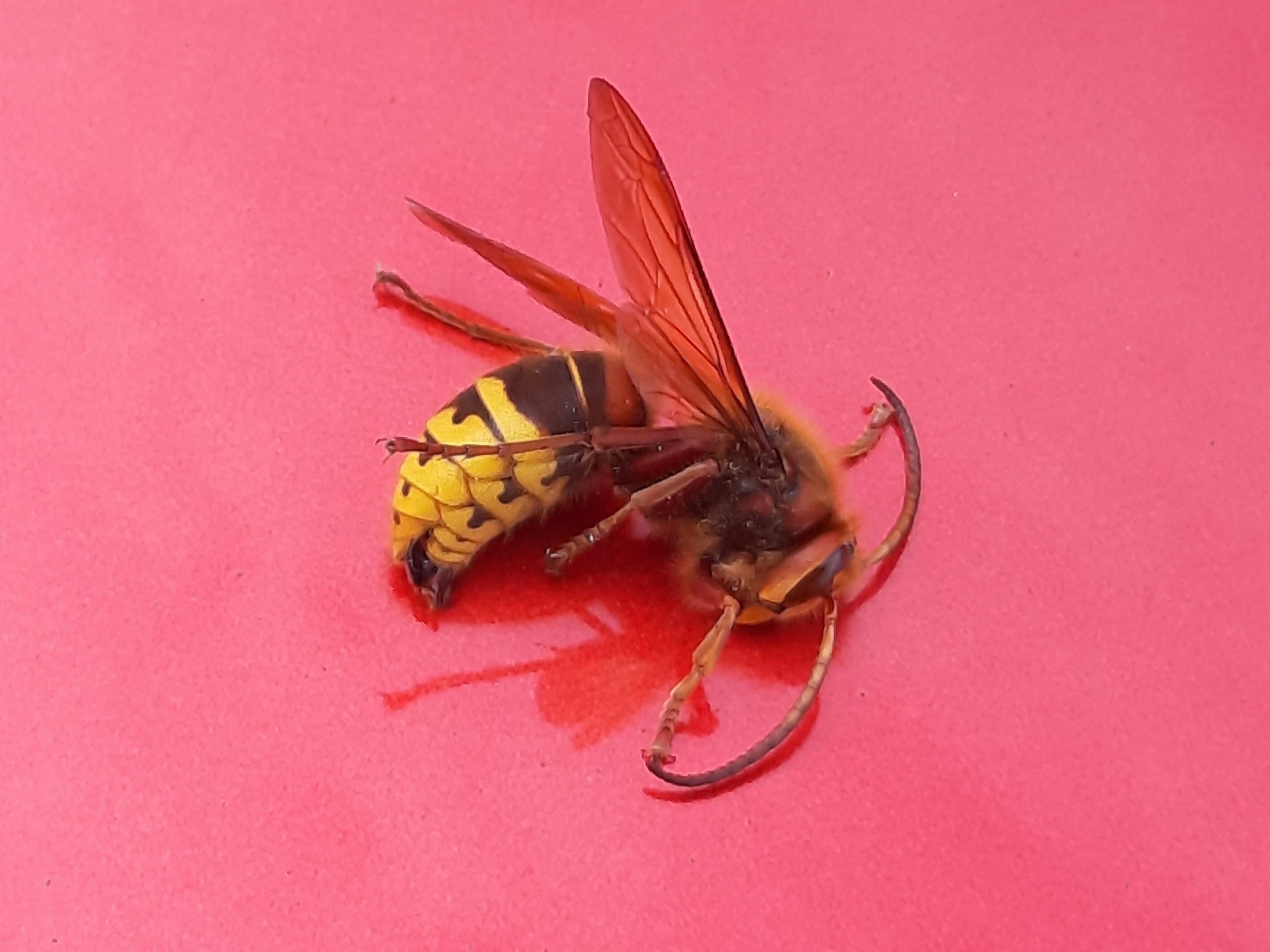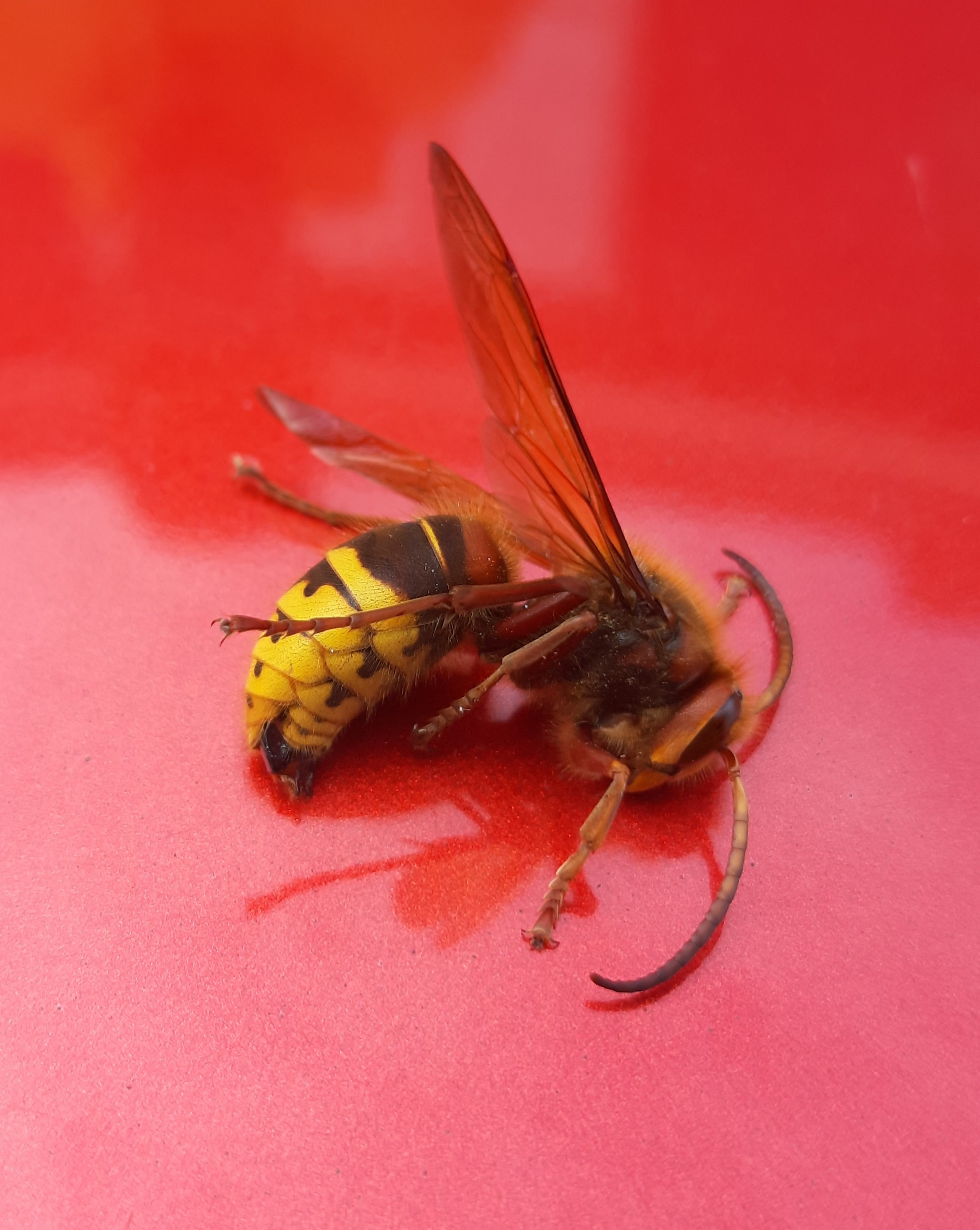 Die Bilder entstammen zwei Serien, die erste mit Bild 1 und 2, die zweite mit den restlichen drei Bildern. Ob es dieselbe Hornisse war,