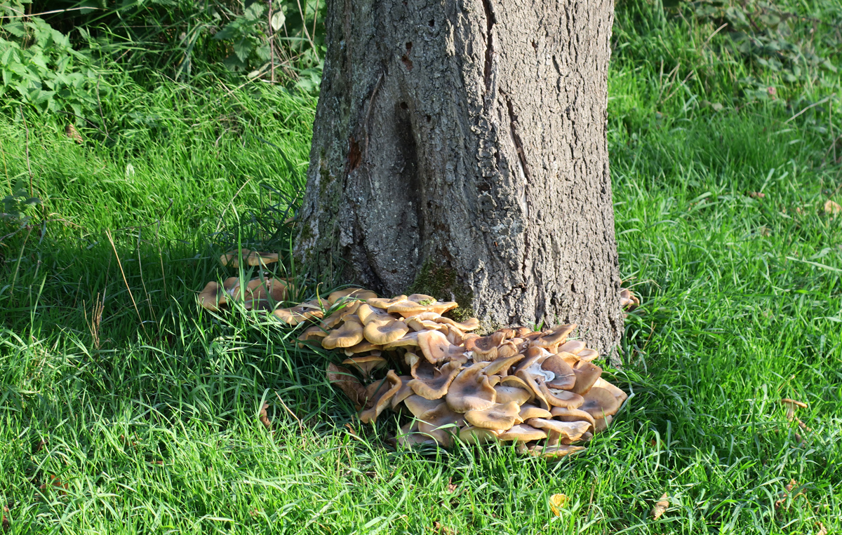 Hallimasch am Fuß eines abgestorbenen Apfelbaumes. Das Myzel von