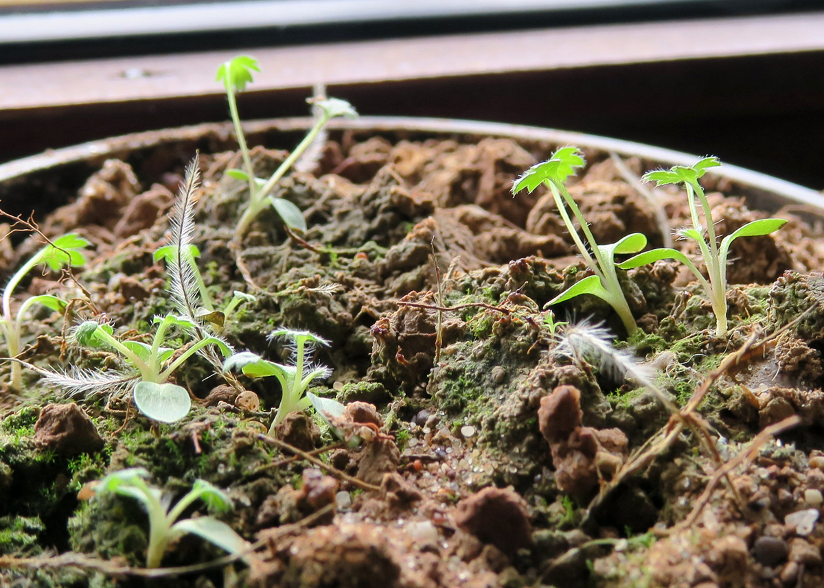 Das Bild zeigt noch einige der behaarten Anhänge, sowie Keimlinge, die neben den ovalen Keimblättern bereits die ersten gelappten Blättchen geschoben haben.