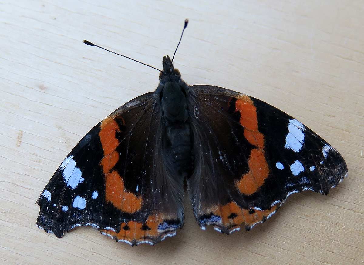 Ein Admiral in Winterruhe. Beim Arbeiten an einem hölzernen Hackstock flatterte er mir plötzlich vor die Füße.