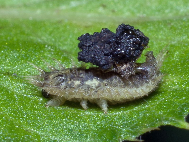 Hier wird eine Blattkäfer-Larve vorgestellt, die mit ihrer Schwanzgabel einem Türmchen aus ihren früheren Exuvien über dem Rücken hält.