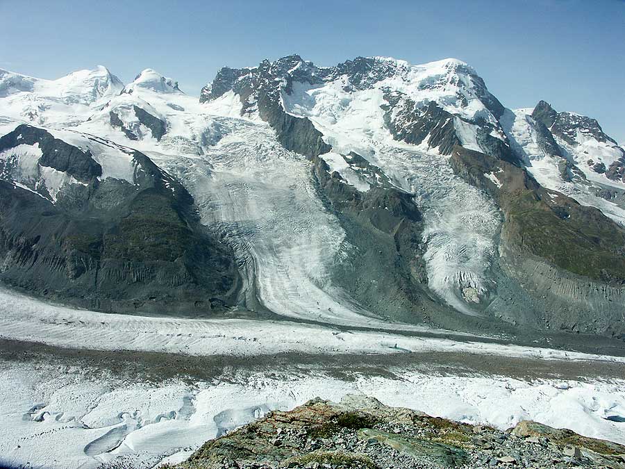 Der Blick fällt auf den nach rechts, Richtung Zermatt, ziehenden Gornergletscher mit seiner breiten Mittelmoräne, und auf die beiden ihm zuströmenden Schwärze- und Breithorngletscher. Den Horizont bilden (v. links) die beiden weißen Spitzen von Castor (4.226 m) und Pollux (4.091 m), das Breithorn mit 4.165 m, und ganz rechts die schwarze Spitze des Kleinen Matterhorns (3.883 m).