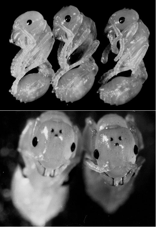 Oben von links: Eine normale Arbeiterinnenpuppe (ohne Ocellen); eine Mikrogynen-Puppe (mit Ocellen auf dem Kopf und bereits grau gefärbten Flügelscheiden); eine Arbeiterinnenpuppe mit Ocellen. Unten: Frontalansichten links der Mikrogynen-Puppe, rechts der Arbeiterinnenpuppe mit gleich gut entwickelten Ocellen.