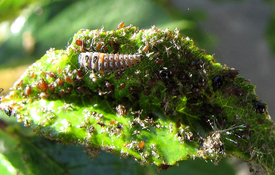 Marienkäferlarve in einer Kolonie von Kirschenblattläusen.