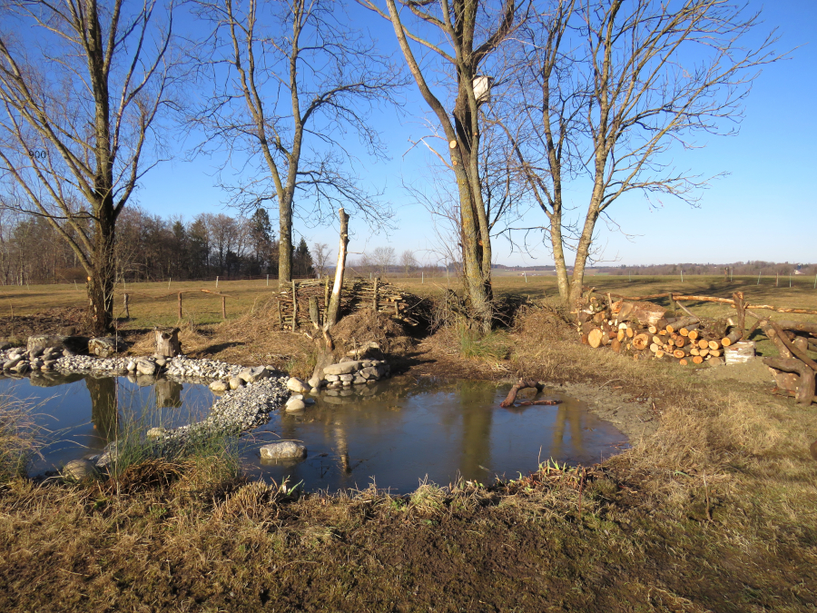 Holzbeigen, Holzhaufen und eine neu gepflanzte Hecke bieten weitere Lebensräume für diverse Arten.