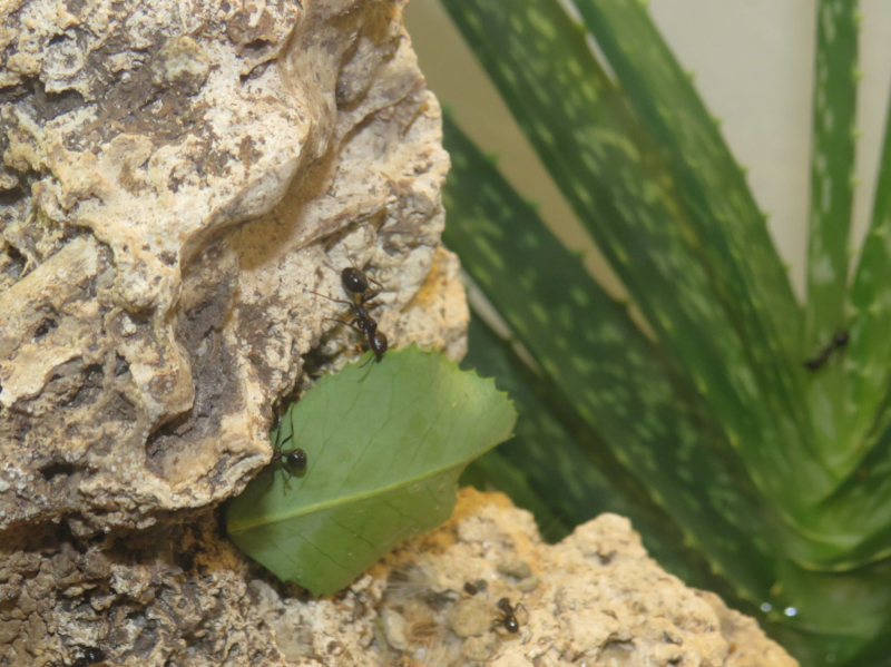 Auf dem Bild sieht man die Bemühungen der Messor-Arbeiterinnen das Blättchen auf den Müll zu befördern.